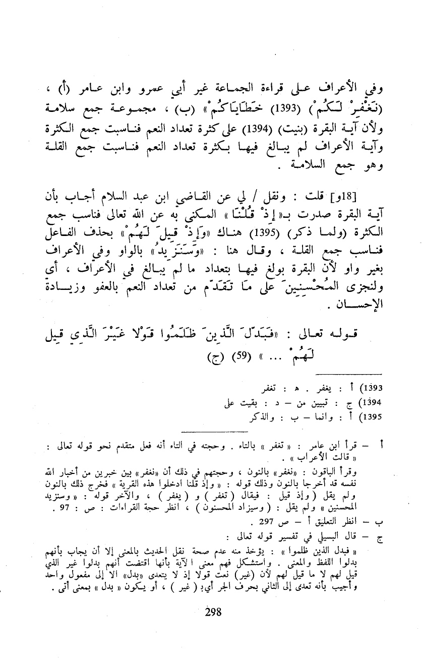 وقلت: ونقل/ لي عن القاضي ابن عبد السلام أجاب بأن آية البقرة صدرت ب «إِذْ قُلْنَا» المكنى به عن الله تعالى فناسب جمع الكثرة (ولما ذكر) هنا {وَإِذْ قِيلَ لَهُمُ} بحذف الفاعل فناسب جمع القلة، وقال هناك «وَسَنَزِيدُ» بالواو وفي الأعراف بغير واو لأن البقرة بولغ فيها بتعداد ما لم يبالغ في الأعراف، أي ولنجزي المُحْسِنِينَ على مَا تَقَدّم من تعداد النعم بالعفو وزيادة الإحسان.