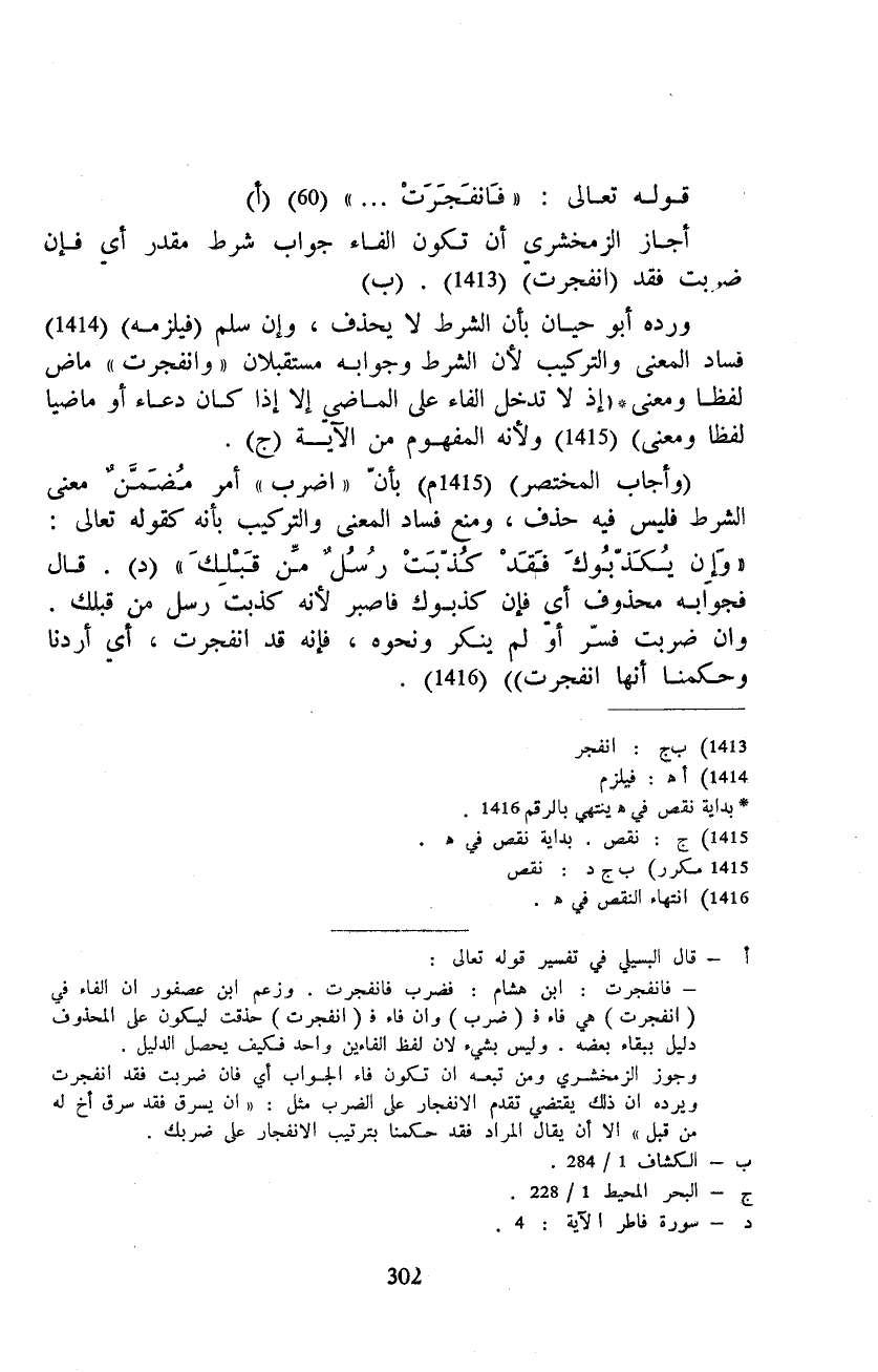 ورده أبو حيان بأن الشرط لا يحذف، وإن سلم (فيلزمه) فساد المعنى والتركيب لأن الشرط وجوابه مستقبلان «وانفجرت» ماض لفظا ومعنى (إذ لا تدخل الفاء على الماضي إلا إذا كان دعاء أو ماضيا لفظا ومعنى) ولأنه المفهوم من الآية.