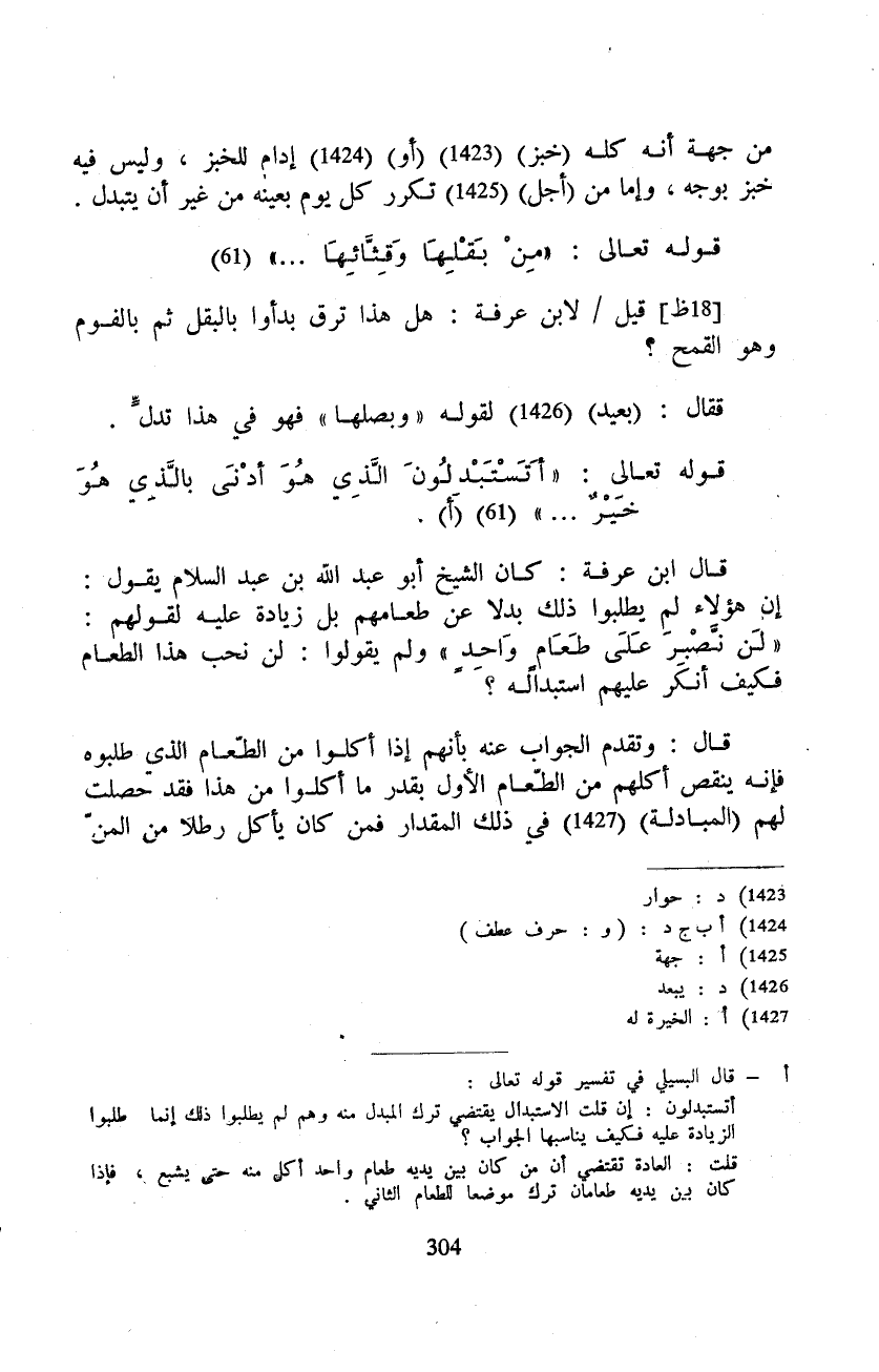 قال ابن عرفة: كان الشيخ أبو عبد الله بن سلام يقول: إن هؤلاء لم يطلبوا ذلك بدلا من طعامهم بل زيادة عليه لقولهم: {لَن نَّصْبِرَ عَلَى طَعَامٍ وَاحِدٍ} ولم يقولوا: لن نحب هذا الطعام فكيف أنكر عليهم استبداله؟