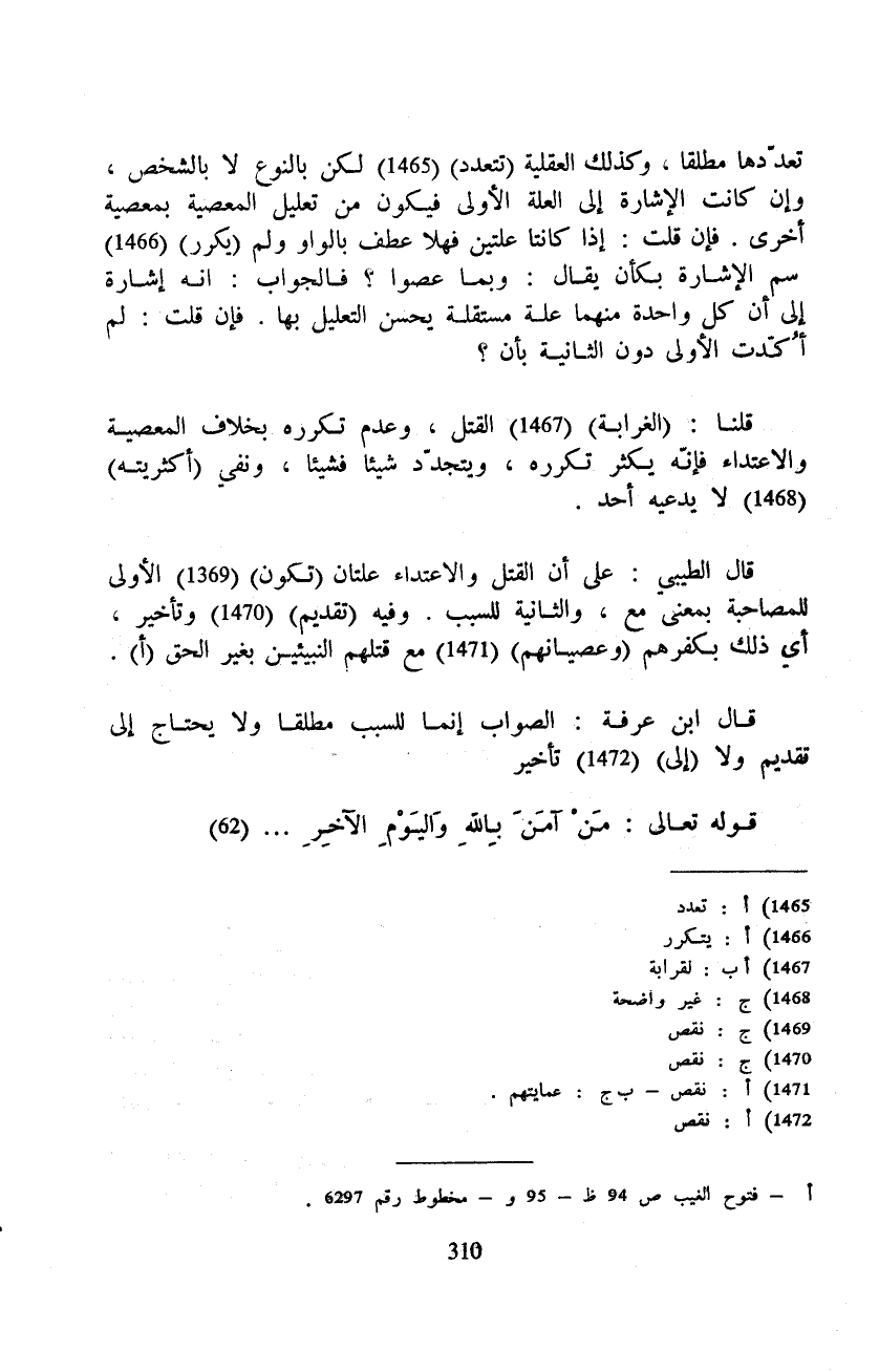 تعدّدها مطلقا، وكذلك العقلية (تتعدد) لكن بالنوع لا بالشخص، وإن كانت الإشارة إلى العلة الأولى فيكون من تعليل المعصية بمعصية أخرى. فإن قلت: إذا كانتا علتين فهلا عطف بالواو ولم (يكرر) سم الإشارة بكأن يقال: وبما عصوا؟ فالجواب: أنه إشارة إلى أن كل واحدة منهما علة مستقلة يحسن التعليل بها. فإن قلت: لم أُكّدت الأولى دون الثانية بأن؟