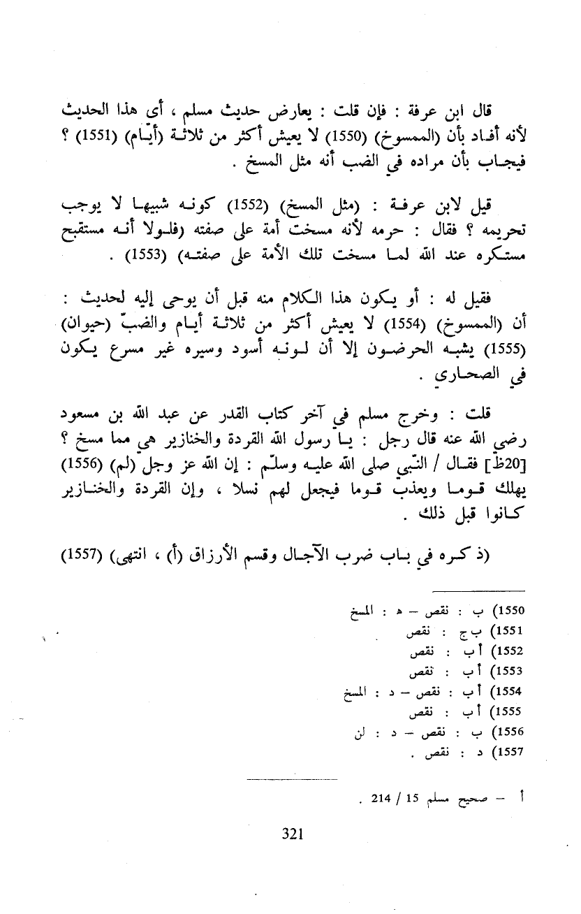 قال ابن عرفة: فإن قلت: يعارض حديث مسلم، أي هذا الحديث لأنه أفاد بأن (الممسوخ) لا يعيش أكثر من ثلاثة (أيام) ؟ فيجاب بأن مراده في الضب أنه مثل المسخ.