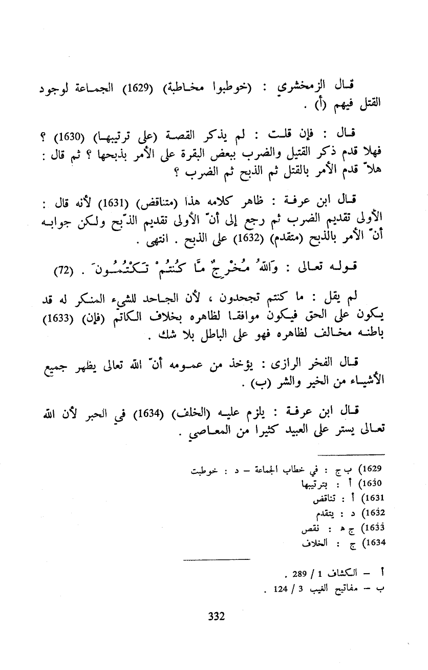 قال ابن عرفة: ظاهر كلامه هذا (متناقض) لأنه قال: الأولى بتقديم الضرب ثم رجع إلى أنّ الأولى تقديم الذّبح ولكن جوابه أنّ الأمر بالذبح (متقدم) على الذبح. انتهى.