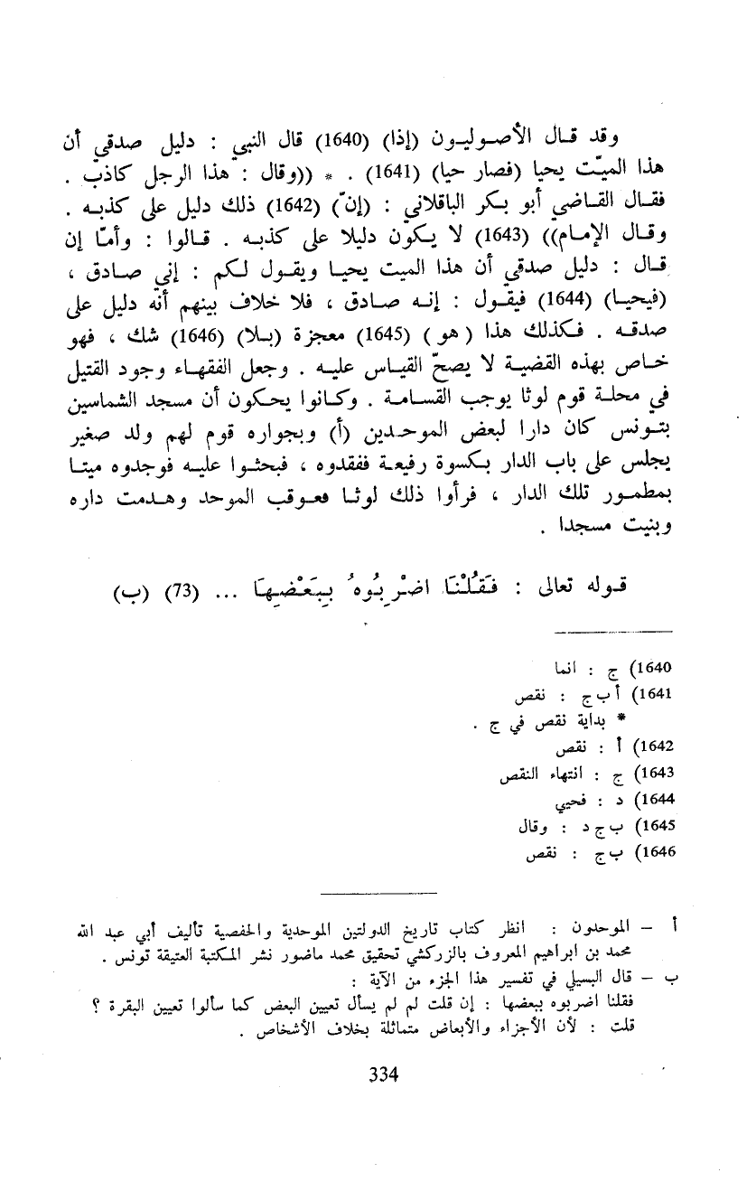 وقد قال الأصوليون (إذا) قال النبي: دليل صدقي أن هذا الميّت يحيا (فصار حيا) . ((وقال: هذا الرجل كاذب. فقال القاضي أبو بكر الباقلاني: (إنّ) ذلك دليل على كذبه. وقال الإمام)) لا يكون دليلا على كذبه. قالوا: وأمّا إن قال: دليل صدقي أن هذا الميت يحيا ويقول لكم: إني صادق، (فيحيا) فيقول: إنه صادق، فلا خوف بينهم أنه دليل على صدقة. فكذلك هذا (هو) معجزة (بلا) شك، فهو خاص بهذه القضية لا يصحّ القياس عليه. وجعل الفقهاء وجود القتيل في محلة قوم لوثا يوجب القسامة. وكانوا يحكون أن مسجد الشماسين بتونس كان دار لبعض الموحدين وبجواره قوم لهم ولد صغير يجلس على باب الدار بكسوة رفيعة ففقدوه، فبحثوا عليه فوجدوه ميتا بمطمور تلك الدار، فرأوا ذلك لوثا فعوقب الموحد وهدمت داره وبنيت مسجدا.