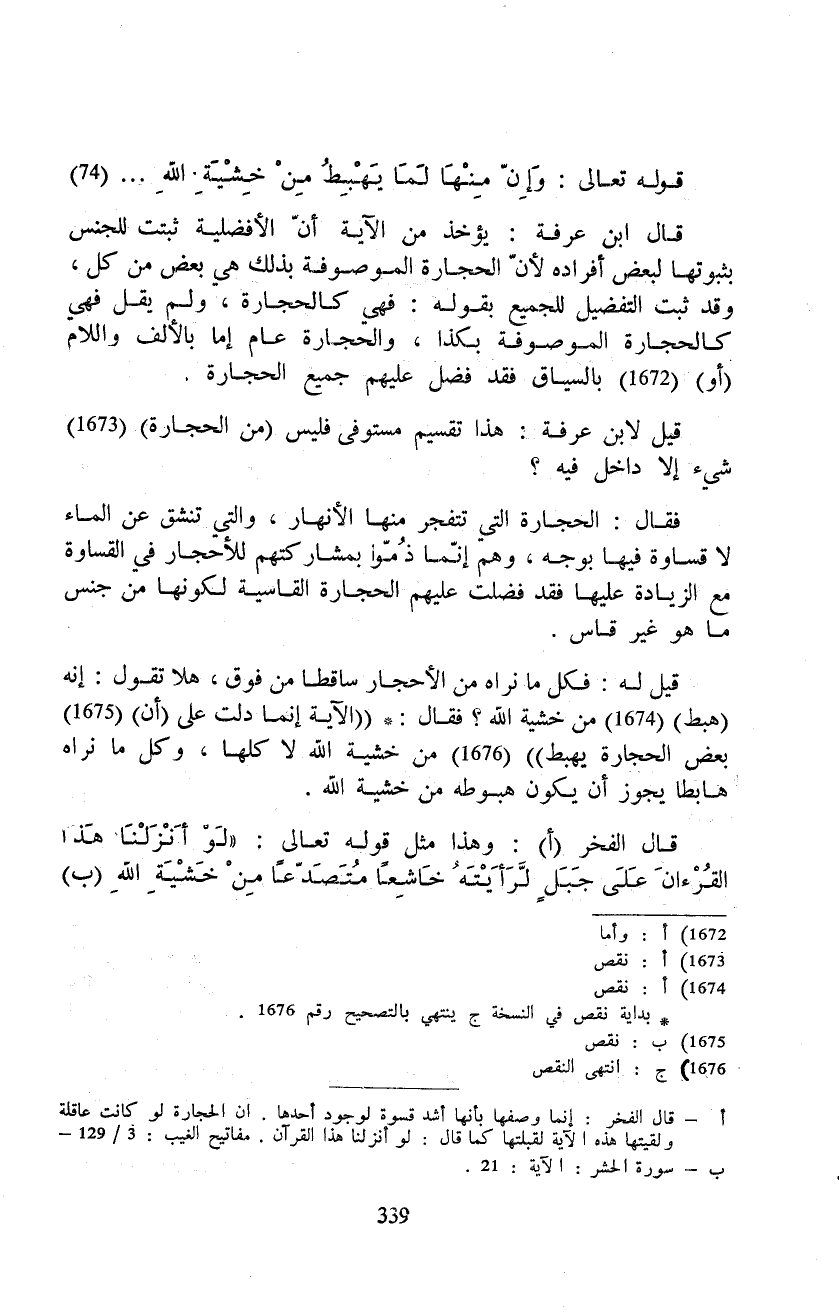 قيل له: فكل ما نراه من الأحجار ساقطا من فوق، هلا تقول: إنه (هبط) من خشية الله؟ فقال: ((الآية إنما دلت على (أن) بعض الحجارة يهبط)) من خشية الله لا كلها، وكل ما نراه هابطا يجوز أن يكون هبوطه من خشية الله.