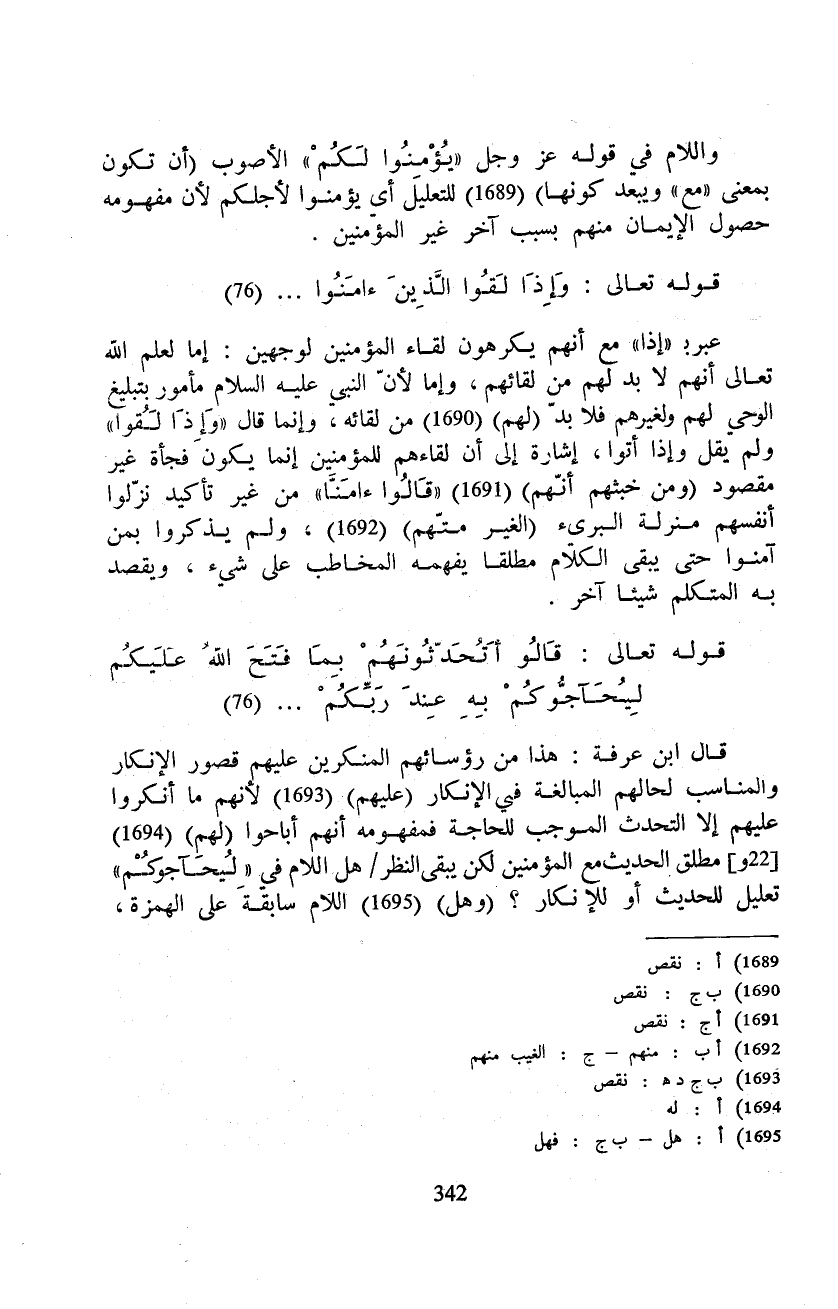 قال ابن عرفة: هذا من رؤسائهم المنكرين عليهم قصور الإنكار والمناسب لحالهم المبالغة في الإنكار (عليهم) لأنهم ما أنكروا عليهم إلا التحدث الموجب للحاجة فمفهومه أنهم أباحوا (لهم) مطلق الحديث مع المؤمنين لكن يبقى النظر/ هل اللام في «لِيُحَآجُّوكُم» تعليل للحديث أو للإنكار؟ (وهل) اللام سابقة على الهمزة، (