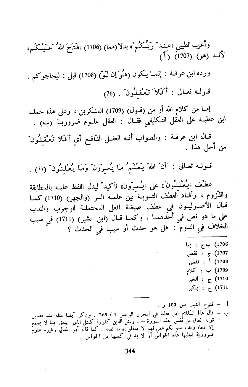قال ابن عرفة: والصواب أنه العقل النّافع أي أَفَلاَ تَعْقِلُونَ من أجل هذا.