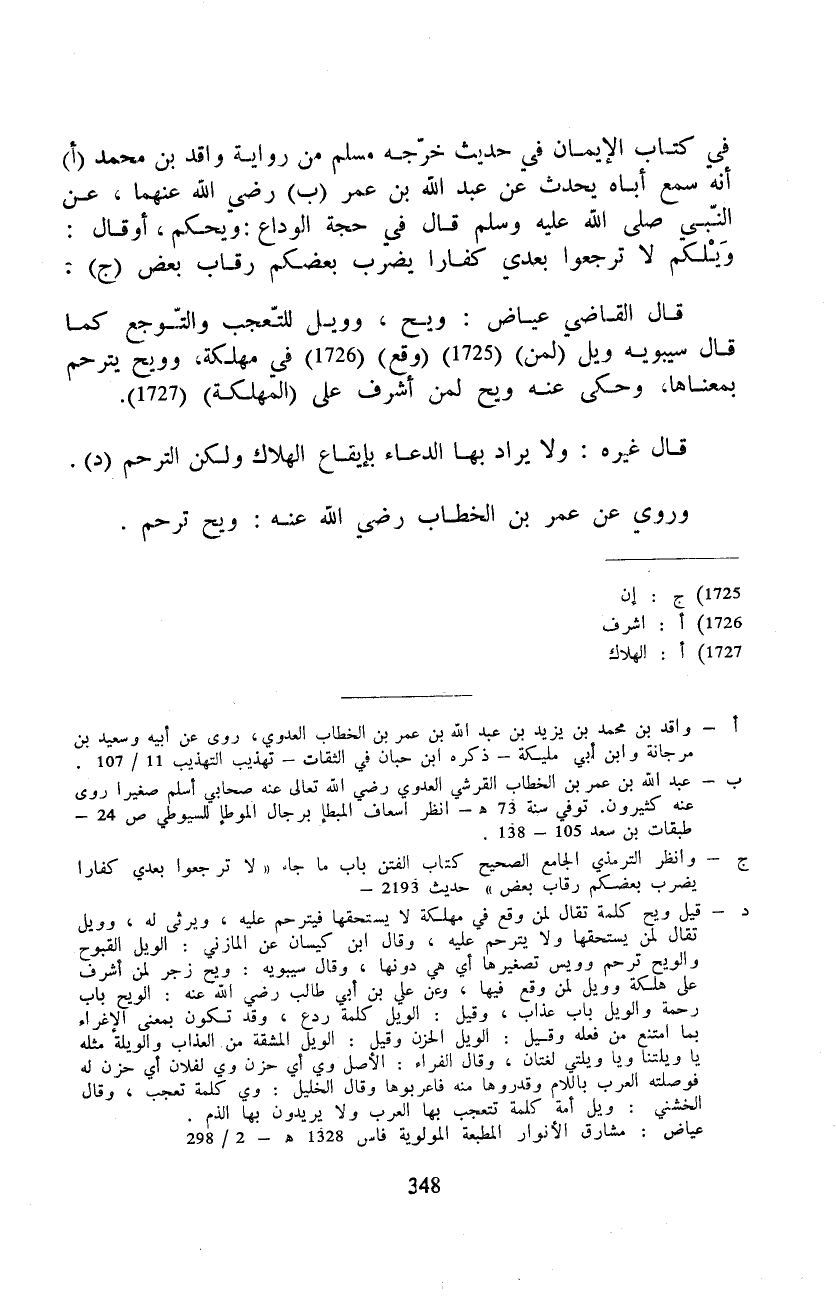 في كتاب الإيمان في حديث خرّجه مسلم من رواية واقد بن محمد أنه سمع أباه يحدث عن عبد الله بن عمر رَضِيَ اللَّهُ عَنْهما، عن النّبي صَلَّى اللَّهُ عَلَيْهِ وَسَلَّم َ قال في حجة الوداع: «ويحكم، أو قال: وَيْلَكم لا ترجعوا بعدي كفارا يضرب بعضكم رقاب بعض» .