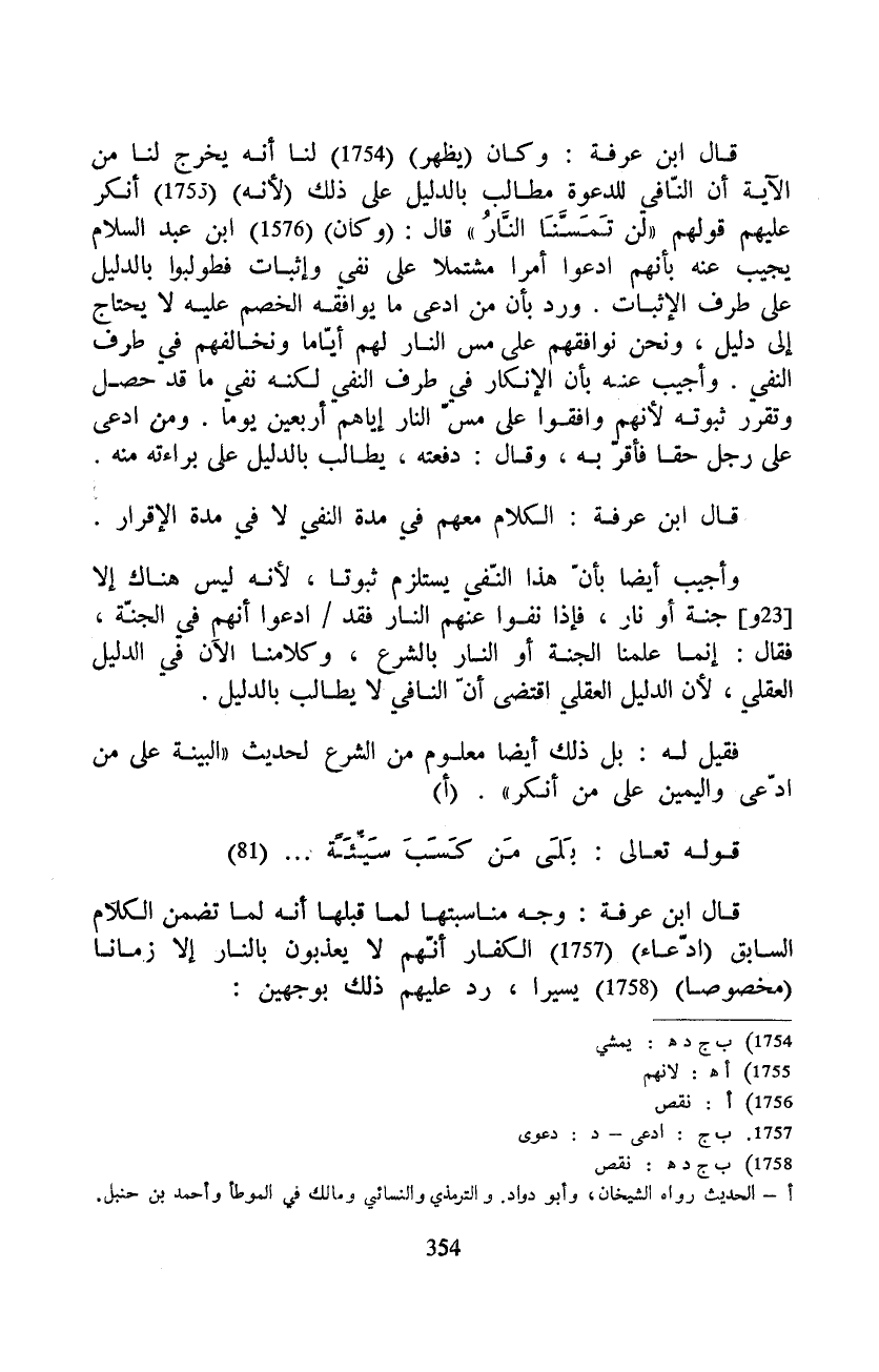 قال ابن عرفة: وكان (يظهر) لنا أنه يخرج لنا من الآية أن النّافي للدعوة مطالب بالدليل على ذلك (لأنه) أنكر عليهم قولهم {لَن تَمَسَّنَا النار} قال: (وكان) ابن عبد السلام يجيب عنه بأنهم ادعوا أمرا مشتملا على نفي وإثبات فطولبوا بالدليل على طرف الإثبات. ورد بأن من ادعى ما يوافقه الخصم عليه لا يحتاج إلى دليل، ونحن نوافقهم على مس النار لهم أيّاما ونخالفهم في طرف النفي. وأجيب عنه بأن الإنكار في طرف النفي لكنه نفي ما قد حصل وتقرر ثبوته لأنهم وافقوا على مسّ النار إياهم أربعين يوما. ومن ادعى على رجل حقا فأقرّ به، وقال: دفعته، يطالب بالدليل على براءته منه.