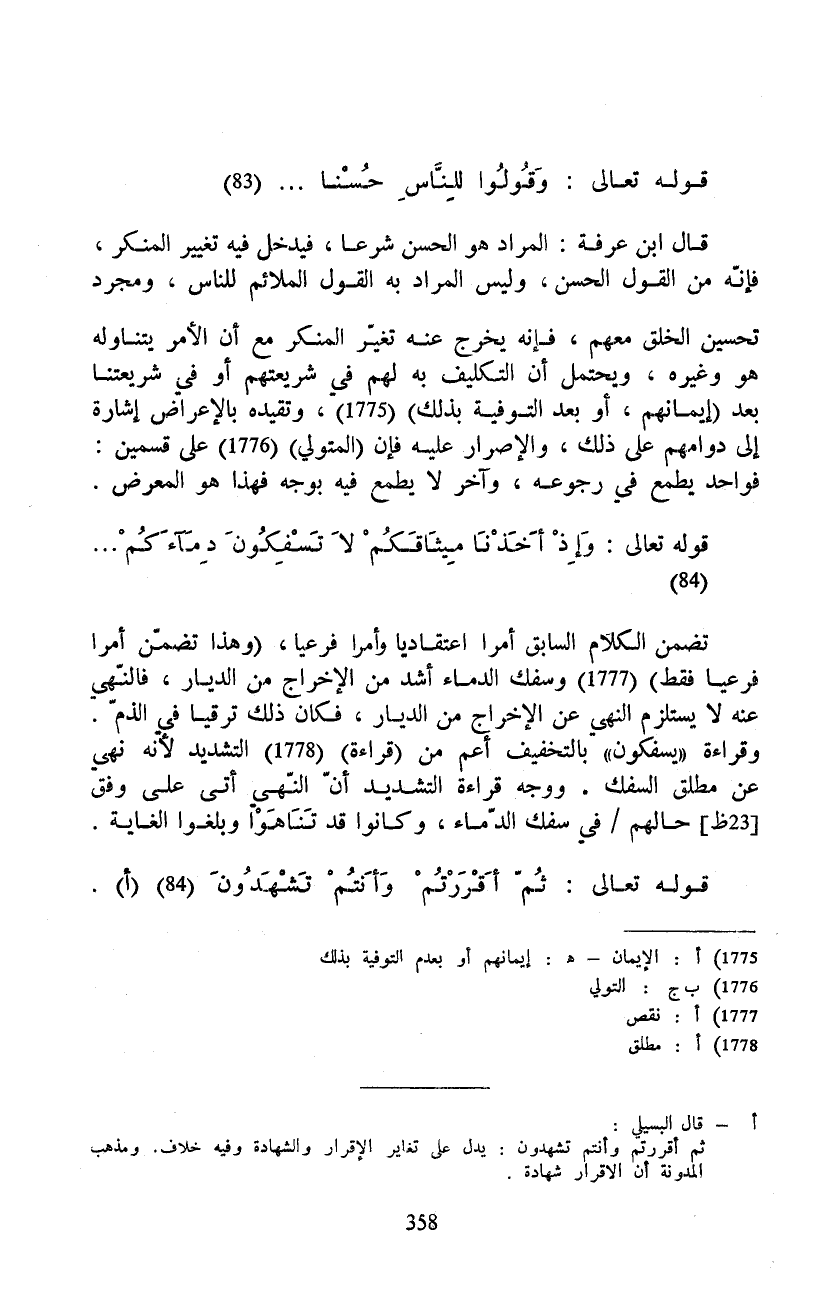 تضمن الكلام السابق أمرا اعتقاديا وأمرا فرعيا، (وهذا تضمّن أمرا فرعيا فقط) وسفك الدماء أشد من الإخراج من الديار، فالنّهي عنه لا يستلزم النهي عن الإخراج من الديار، فكان ذلك ترقيا في الذمّ. وقراءة «يسفكون» بالتخفيف أعم من (قراءة) التشديد لأنه نهي عن مطلق السفك. ووجه قراءة التشديد أنّ النّهي أتى على وفق حالهم/ في سفك الدّماء، وكانوا قد تَنَاهَوْا وبلغوا الغاية.