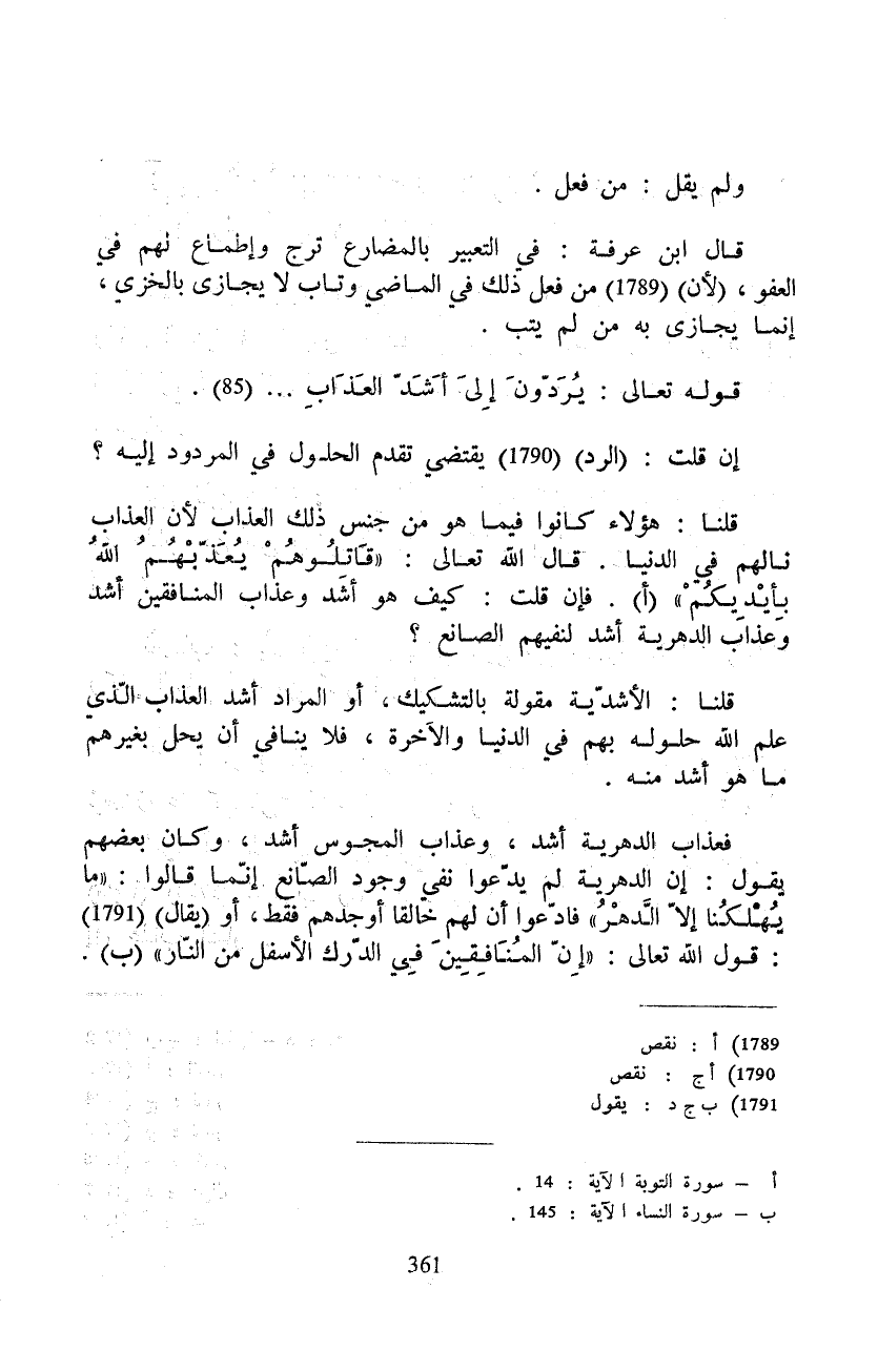 فعذاب الدهرية أشد، وعذاب المجوس أشد، وكان بعضهم يقول: إن الدهرية لم يدّعوا نفي وجود الصّانع إنّما قالوا: {وَمَا يُهْلِكُنَآ إلاّ الدهر} فادّعوا أن لهم خالقا أوجدهم فقط، أو (يقال) : قوله تعالى: {إِنَّ المنافقين فِي الدرك الأسفل مِنَ النار}