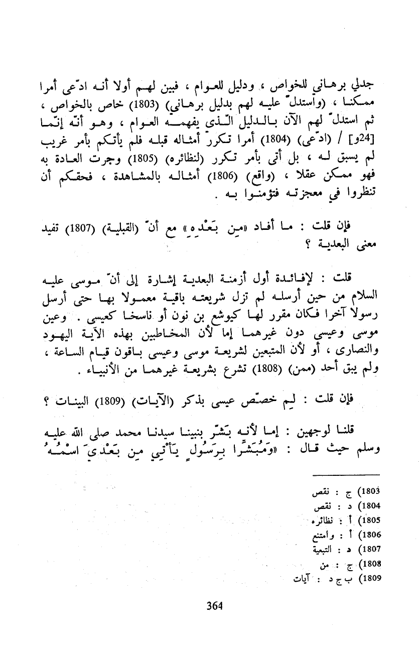جدلي برهاني للخواص، ودليل للعوام، فبين لهم أولا أنه ادّعى أمرا ممكنا، (واستدلّ عليه لهم بدليل برهاني) خاص بالخواص، ثم استدلّ لهم الآن بالدليل الّذي يفهمه العوام، وهو أنّه إنّما (ادّعى) أمرا تكرر أمثاله قبله فلم يأتكم بأمر غريب فهو ممكن عقلا، (واقع) أمثاله بالمشاهدة، فحقكم أن تنظروا في معجزته فتؤمنوا به.