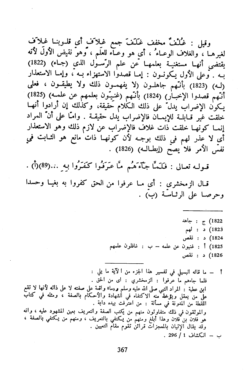 وقيل: غُلْف مخفف غَلَفَ جمع غِلاَفٍ أي قلوبنا غِلاَف لغيرها، والغلاف الوعاءُ، أي هو وعاء للعلم، وهو نقيض الأول لأنه يقتضي أنها مستغنية بعلمها عن علم الرّسول الذي (جاء) به. وعلى الأول يكونون: إما قصدوا الاستهزاء به، وإما الاستعذار (له) بأنّهم جاهلون (لا يفهمون ذلك ولا يطيقون، فعلى أنّهم قصدوا الإخبار) بأنّهم (غنِيّون بعلمهم عن علمه) يكون الإضراب يدلّ على ذلك الكلام حقيقة، وكذلك إن أرادوا أنها خلقت غير قابلة للإيمان فالإضراب عن لازم ذلك وهو الاستعذار أي لا عذر لهم في ذلك بوجه لأن كونها ذات مانع هو الثابت في نفس الأمر فلا يصح (إبطاله) .