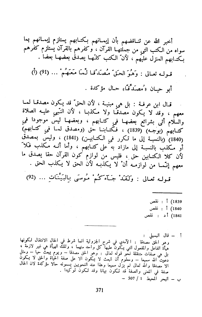 قال ابن عرفة: بل هي مبنية، لأن الحقّ قد يكون مصدقا لما معهم، وقد لا يكون مصدقا ولا مكذبا، لأن النّبي عَلَيْهِ الصَّلَاة وَالسَّلَام ُ أتى بشرائع بعضها في كتابهم، وبعضها ليس موجودا في كتابهم (بوجه) ، فكتابنا حق (ومصدق لما في كتابهم) (بالنسبة إلى ما تكرر في الكتابين) ، وليس بمصدق أو مكذب بالنسبة إلى ما زاد به على كتابهم، وأما أنه مكذب فَلاَ لأن كلا الكتابين حق، فليس من لوازم كون القرآن حقا يصدق ما معهم إنّما من لوازمه أنْ لا يكذبه لأن الحق لا يكذب الحق.