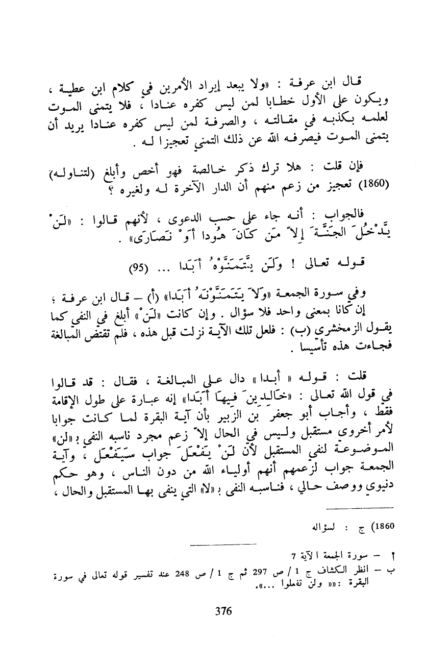وفي سورة الجمعة {وَلاَ يَتَمَنَّوْنَهُ أَبَداً} - قال ابن عرفة؛ إن كانا بمعنى واحد فلا سؤال. وإن كانت «لَن» أبلغ في النفي كما يقول الزمخشري: فلعل تلك الآية نزلت قبل هذه، فلم تقتض المبالغة فجاءت هذه تأسيسا.