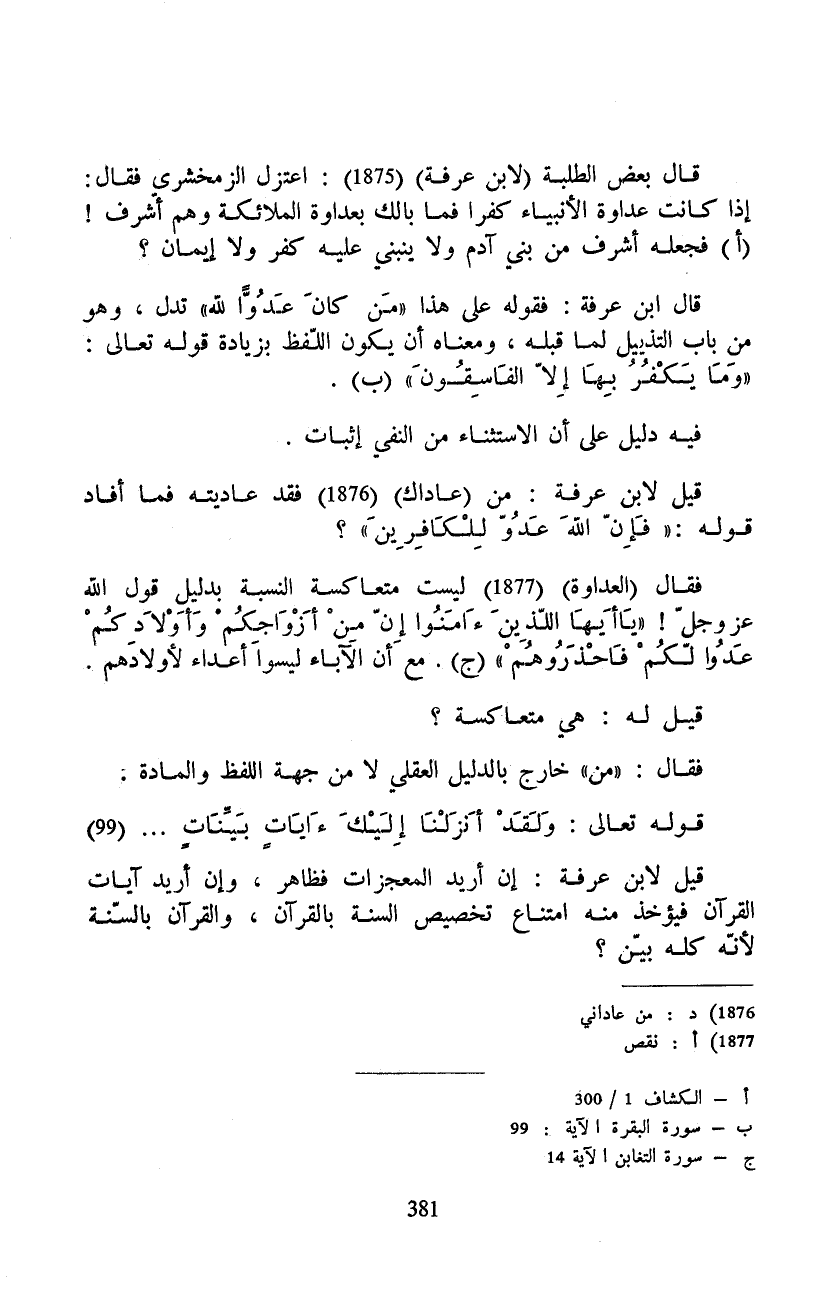 قيل لابن عرفة: من (عاداك) فقد عاديته فما أفاد قوله: {فَإِنَّ الله عَدُوٌّ لِّلْكَافِرِينَ} فقال (العداوة) ليست متعاكسة النسبة بدليل قول الله عَزَّ وَجَلَّ ّ} {ياأيها الذين ءامنوا إِنَّ مِنْ أَزْوَاجِكُمْ وَأَوْلاَدِكُمْ عَدُوّاً لَّكُمْ فاحذروهم} مع أن الآباء ليسوا أعداء لأولادهم.