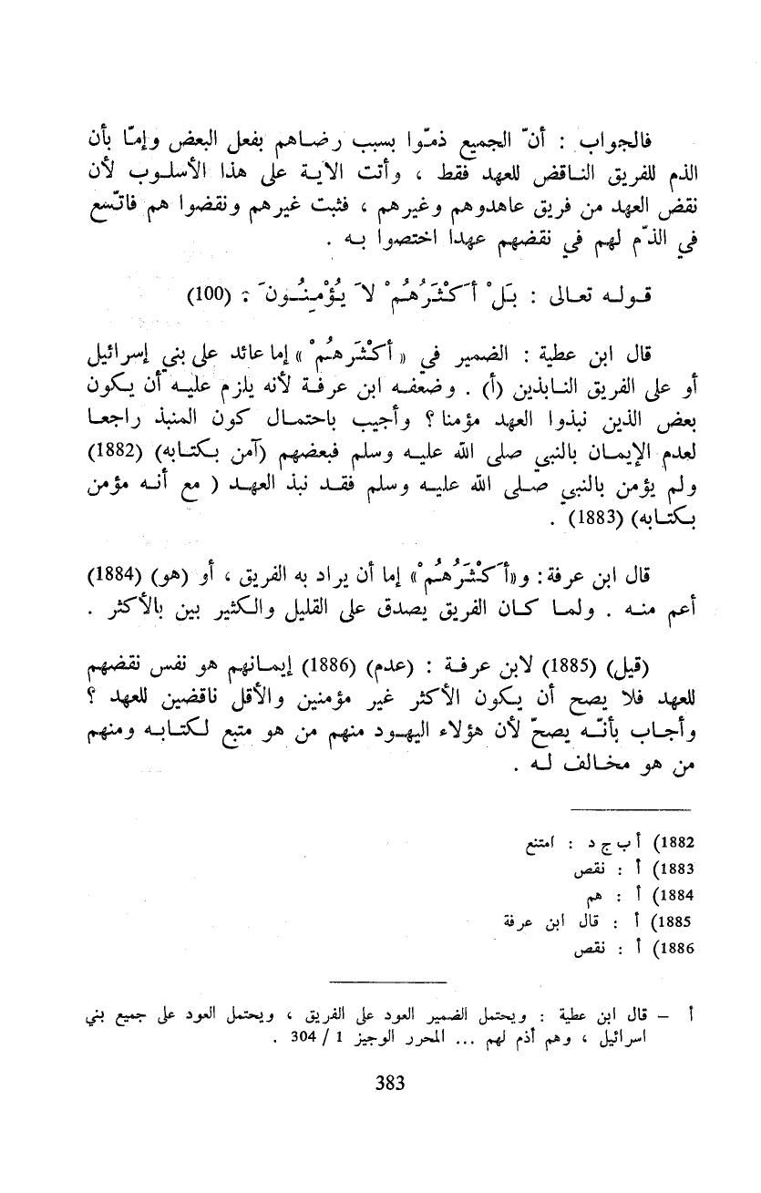قال ابن عطية: الضمير في «أكْثَرهُمْ» إما عائد على بني إسرائيل أو على الفريق النابذين. وضعفه ابن عرفة لأنه يلزم عليه أن يكون بعض الذين نبذوا العهد مؤمنا؟ وأجيب باحتمال كون المنبذ راجعا لعدم الإيمان بالنبي صَلَّى اللَّهُ عَلَيْهِ وَسَلَّم َ فبعضهم (آمن بكتابه) ولم يؤمن بالنبي صَلَّى اللَّهُ عَلَيْهِ وَسَلَّم َ فقد نبذ العهد (مع أنه مؤمن بكتابه) .