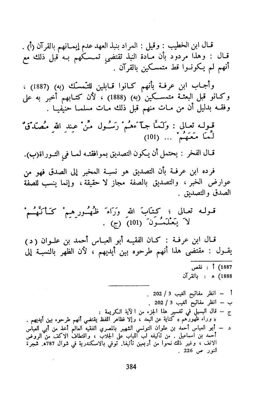 قال ابن الخطيب: وقيل: المراد بنبذ العهد عدم إيمانهم بالقرآن. قال: وهذا مردود بأن مادة النبذ تقتضي تمسكهم به قبل ذلك مع أنهم لم يكونوا قط متمسكين بالقرآن.