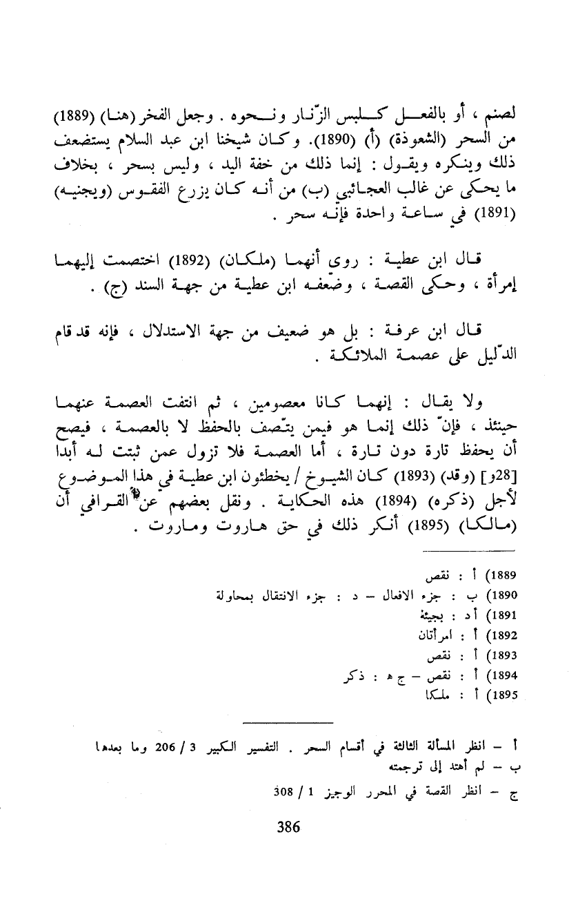 ولا يقال: إنهما كانا معصومين، ثم انتفت العصمة عنهما حينئذ، فإنّ ذلك إنما هو فيمن يتّصف بالحفظ لا بالعصمة، فيصح أن يحفظ تارة دون تارة، أما العصمة فلا تزول عمن ثبتت له أبدا (وقد) كان الشيوخ/ يخطئون ابن عطية في هذا الموضوع لأجل (ذكره) هذه الحكاية. ونقل بعضهم عن القرافي أن (مالكا) أنكر ذلك في حق هاروت وماروت.