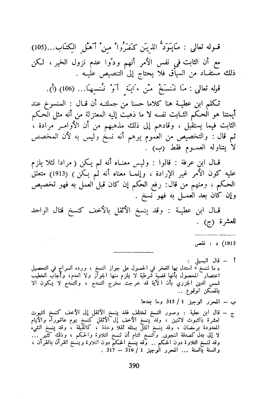 تكلم ابن عطية هنا كلاما حسنا من جملته أن قال: المنسوخ عند أيمتنا هو الحكم الثابت نفسه لا ما ذهبت إليه المعتزلة من أنه مثل الحكم الثابت فيما يستقبل، وقادهم إلى ذلك مذهبهم من أن الأوامر مرادة، ثم قال: والتخصيص من العموم يوهم أنه نسخ وليس به لأن المخصص لا يتناوله العموم فقط.