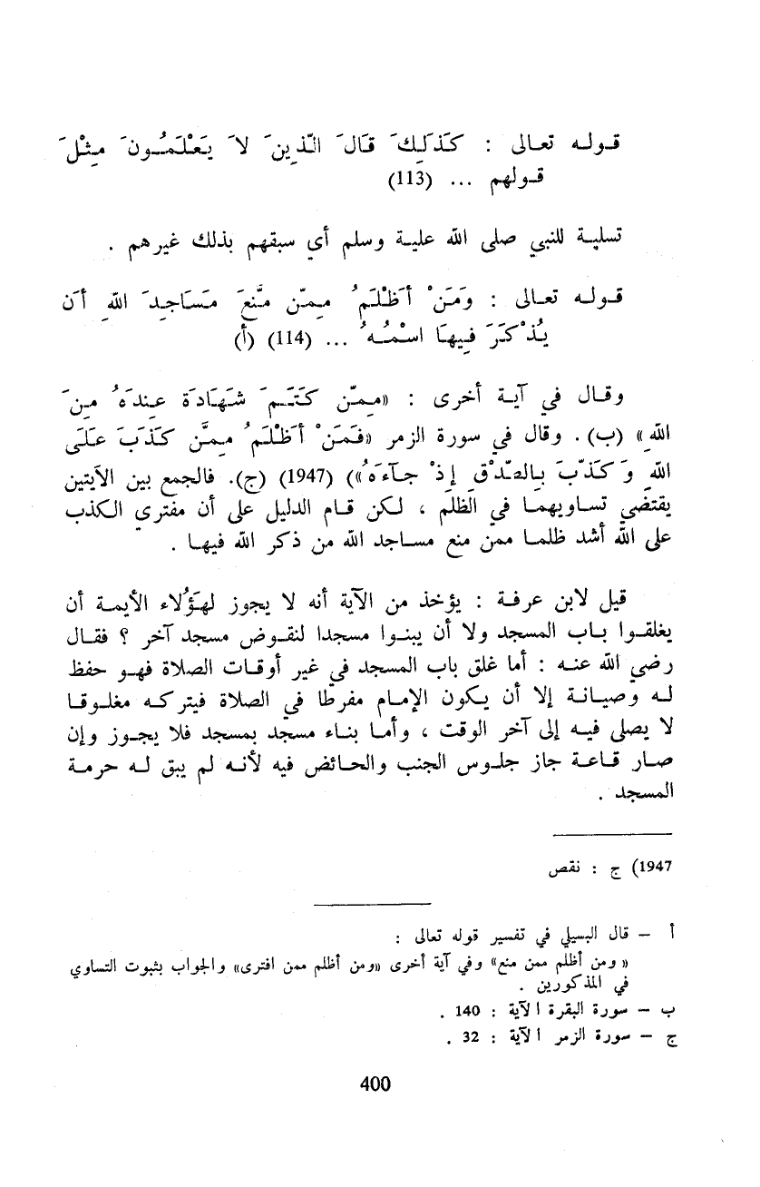 وقال في آية أخرى: {مِمَّن كَتَمَ شَهَادَةً عِندَهُ مِنَ الله} وقال في سورة الزمر {فَمَنْ أَظْلَمُ مِمَّن كَذَبَ علَى الله وَكَذَّبَ بالصدق إِذْ جَآءَهُ} فالجمع بين الآيتين يقتضي تساويهما في الظلم، لكن قام الدليل على أن مفتري الكذب على الله أشد ظلما ممن منع مساجد الله من ذكر الله فيها.
