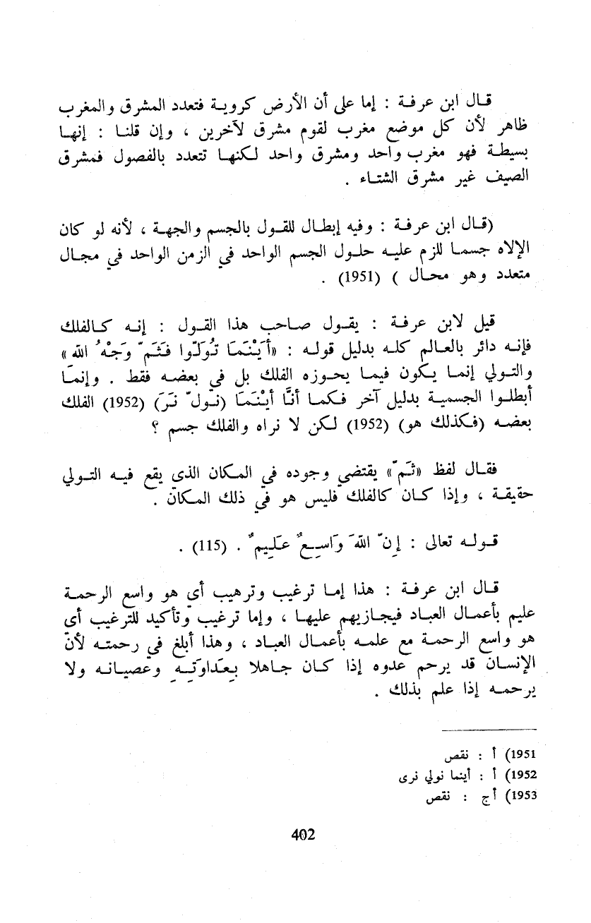 قيل لابن عرفة: يقول صاحب هذا القول: إنه كالفلك فإنه دائر بالعالم كله بدليل قوله: {فَأَيْنَمَا تُوَلُّواْ فَثَمَّ وَجْهُ الله} والتولي إنما يكون فيما يحوزه الفلك بل في بعضه فقط. وإنما أبطلوا الجسمية بدليل آخر فكما أنّا أيْنَما (نولّ نَرَ) الفلك بعضه (فكذلك هو) لكن لا نراه والفلك جسم؟