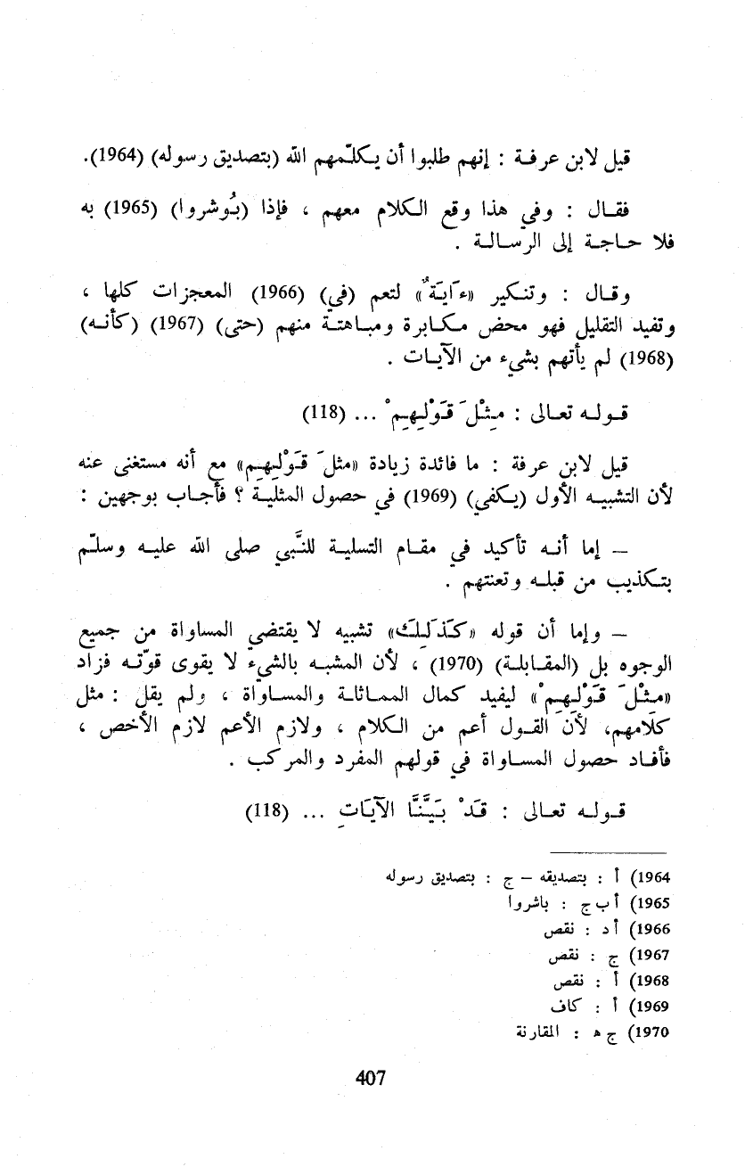 - وإما أن قوله «كَذلِكَ» تشبيه لا يقتضي المساواة من جميع الوجوه بل (المقابلة) ، لأن المشبه بالشيء لا يقوى قوّته فزاد «مِّثْلَ قَوْلِهِمْ» ليفيد كمال المماثلة والمساواة، ولم يقل: مثل كلامهم، لأن القول أعم من الكلام، ولازم الأعم لازم الأخص، فأفاد حصول المساواة في قولهم المفرد والمركب.