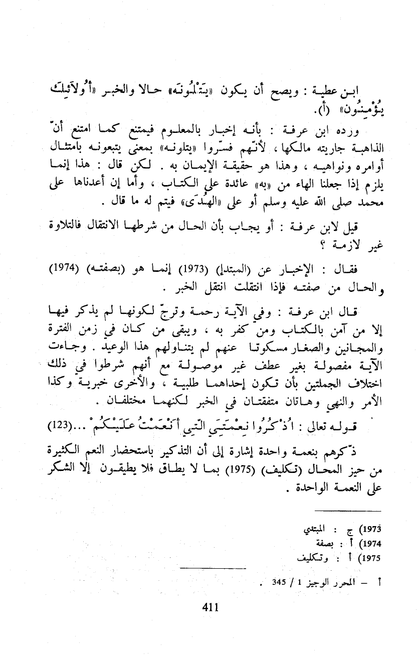ورده ابن عرفة: بأنه إخبار بالمعلوم فيمتنع كما امتنع أنّ الذاهبة جاريته مالكها، لأنّهم فسّروا: يتلونه «بمعنى يتبعونه بامتثال أوامره ونواهيه، وهذا هو حقيقة الإيمان به. لكن قال: هذا إنما يلزم إذا جعلنا الهاء من» به «عائدة على الكتاب، وأما إن أعدناها على محمد صَلَّى اللَّهُ عَلَيْهِ وَسَلَّم َ أو على» الهُدَى «فيتم له ما قال.