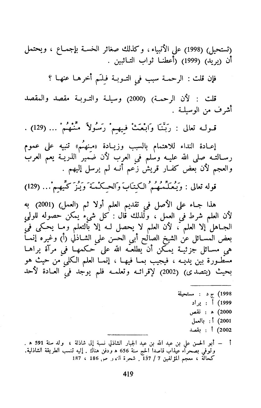 هذا جاء على الأصل في تقديم العلم أولا ثم (العمل) به لأن العلم شرط في العمل، ولذلك قال: كل شيء يمكن حصوله للولي الجاهل إلا العلم، لأن العلم لا يحصل له إلا بالتعلم وما يحكى في بعض المسائل عن الشيخ الصالح أبي الحسن علي الشاذلي وغيره إنما هي مسائل جزئية يمكن أن يطلعه الله على حكمها في مرآة يراها مسطورة بين يديه، فيجيب بما فيها، إنما العلم الكلي من حيث هو بحيث (يتصدى) لإقرائه وتعلمه فلم يوجد في العادة لأحد (