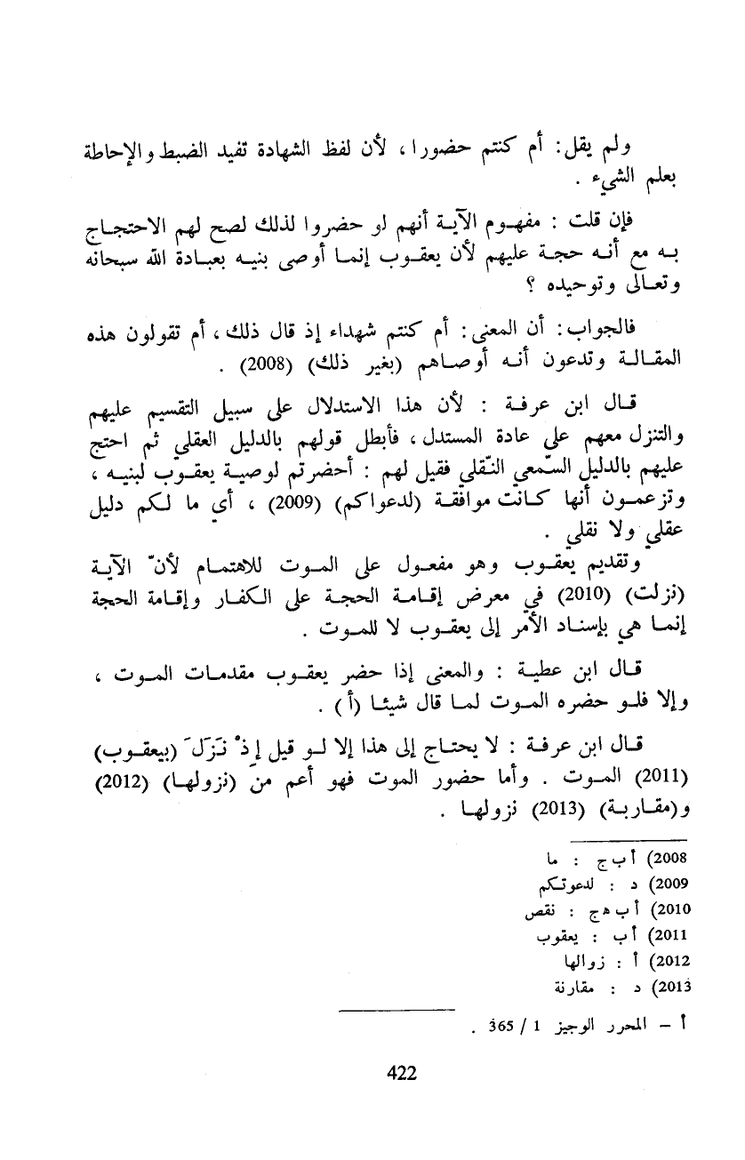 قال ابن عرفة: لا يحتاج إلى هذا إلا لو قيل إِذْ نَزَلَ (بيعقوب) الموت. وأما حضور الموت فهو أعم من (نزولها) و (مقاربة) نزولها.