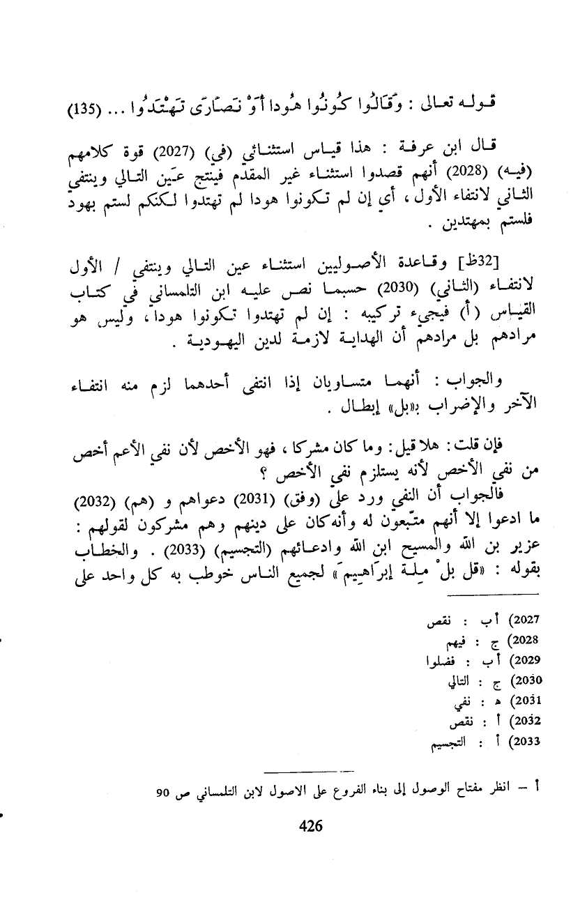 وقاعدة الأصوليين استثناء عين التالي وينتفي/ الأول لانتفاء (الثاني) حسبما نص عليه ابن التلمساني في كتاب القياس فيجيء تركيبه: إن لم تهتدوا تكونوا هودا، وليس هو مرادهم بل مرادهم أن الهداية لازمة لدين اليهودية.
