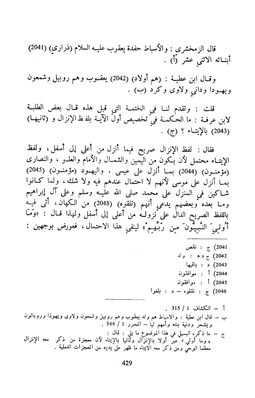 فقال: لفظ الإنزال صريح فيما أنزل من أعلى إلى أسفل، ولفظ الإيتاء محتمل لأن يكون من اليمين والشمال والأمام والعلو، والنصارى (مؤمنون) بما أنزل على عيسى، واليهود (مؤمنون) بما أنزل على موسى لأنهم لا احتمال عندهم فيه ولا شك، ولما كانوا شاكين في المنزل على محمد صَلَّى اللَّهُ عَلَيْهِ وَسَلَّم َ وعلى آل إبراهيم وما بعده وبعضهم يدعي أنهم (تلقوه) من الكهان، أتى فيه باللفظ الصريح الدال على نزوله من أعلى إلى أسفل ولهذا قال: {وَمَآ أُوتِيَ النبيون مِن رَّبِّهِمْ} لينفي هذا الاحتمال، فعورض بوجهين: