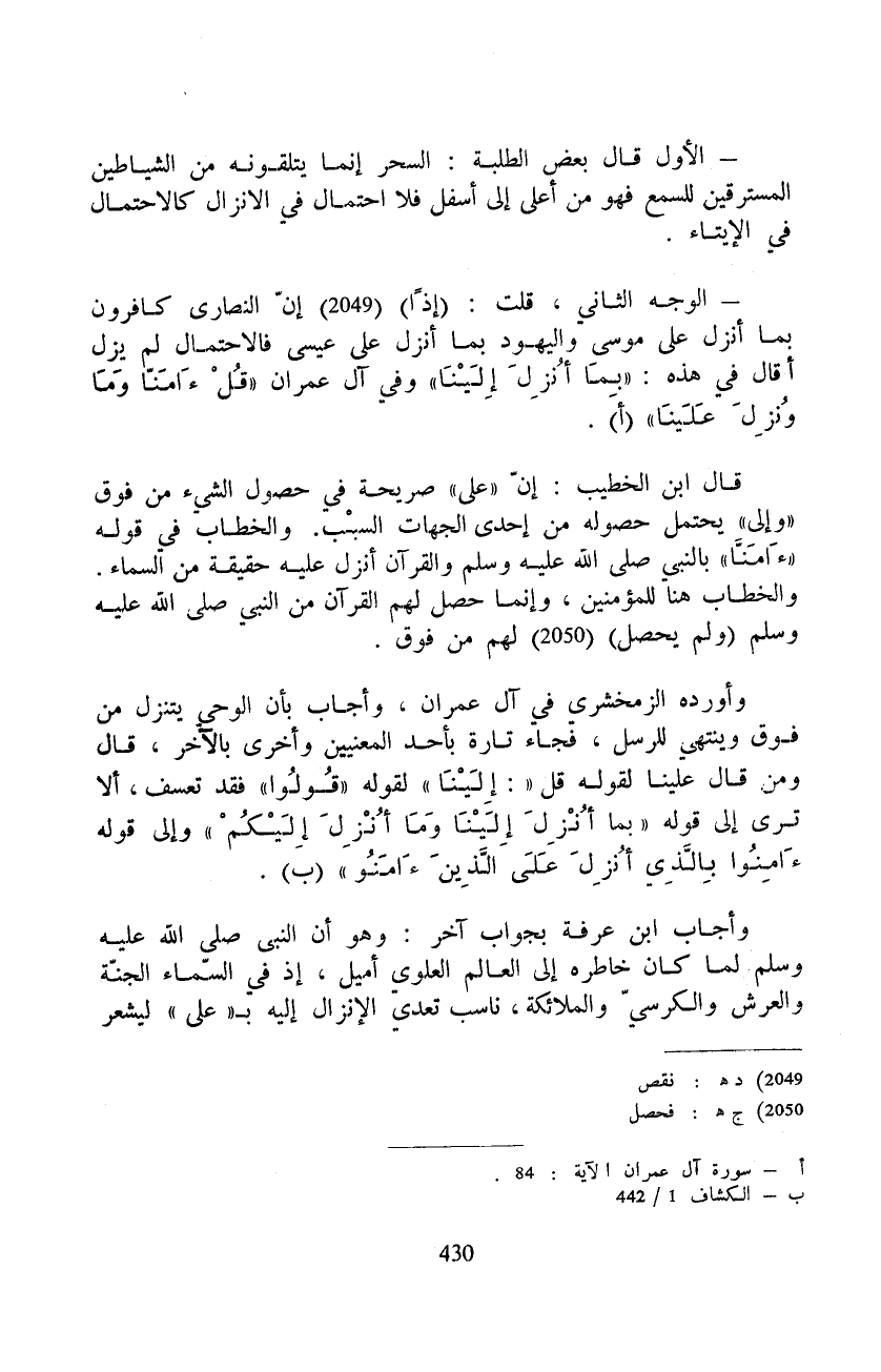 وأورده الزمخشري في آل عمران، وأجاب بأن الوحي يتنزل من فوق وينتهي للرسل، فجاء تارة بأحد المعنيين وأخرى بالآخر، قل ومن قال علينا لقوله قل: «إِلَيْنَا» لقوله «قُولُواْ» فقد تعسف، ألا ترى إلى قوله «بِمَا أُنْزِلَ إِلَيْنَا وَمَا أُنْزِلَ إِلَيْكُمْ» وإلى قوله {ءَامِنُواْ بالذي أُنزِلَ عَلَى الذينءَامَنُواْ} وأجاب ابن عرفة بجواب آخر: وهو أن النبي صَلَّى اللَّهُ عَلَيْهِ وَسَلَّم َ لما كان خاطره إلى العالم العلوي أميل، إذ في السّماء الجنّة والعرش والكرسيّ والملائكة، ناسب تعدي الإنزال إليه ب «على» ليشعر