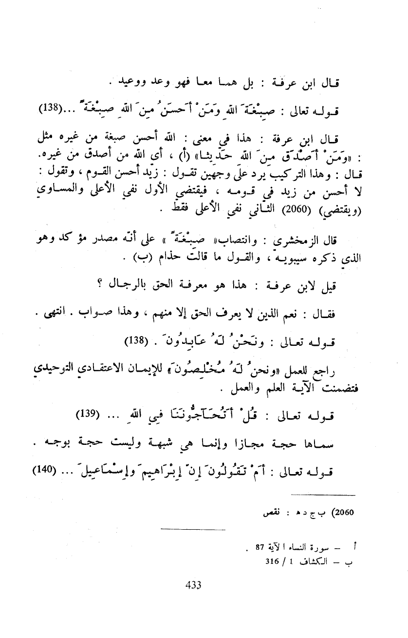 قال ابن عرفة: هذا في معنى: الله أحسن صبغة من غيره مثل: {وَمَنْ أَصْدَقُ مِنَ الله حَدِيثاً} أي الله من أصدق من غيره. قال: وهذا التركيب يرد على وجهين تقول: زيد أحسن القوم، وتقول: لا أحسن من زيد في قومه، فيقتضي الأول نفي الأعلى والمساوي (ويقتضي) الثاني نفي الأعلى فقط.