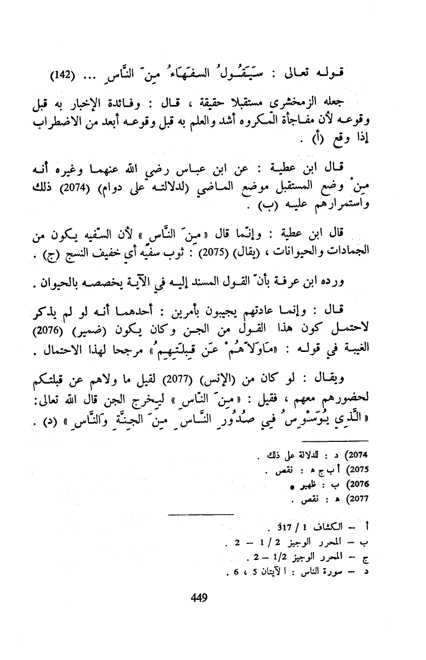 ويقال: لو كان من (الإنس) لقيل ما ولاهم عن قبلتكم لحضورهم معهم، فقيل: {مِنَ النّاسِ} لِيخرج الجن قال الله تعالى: