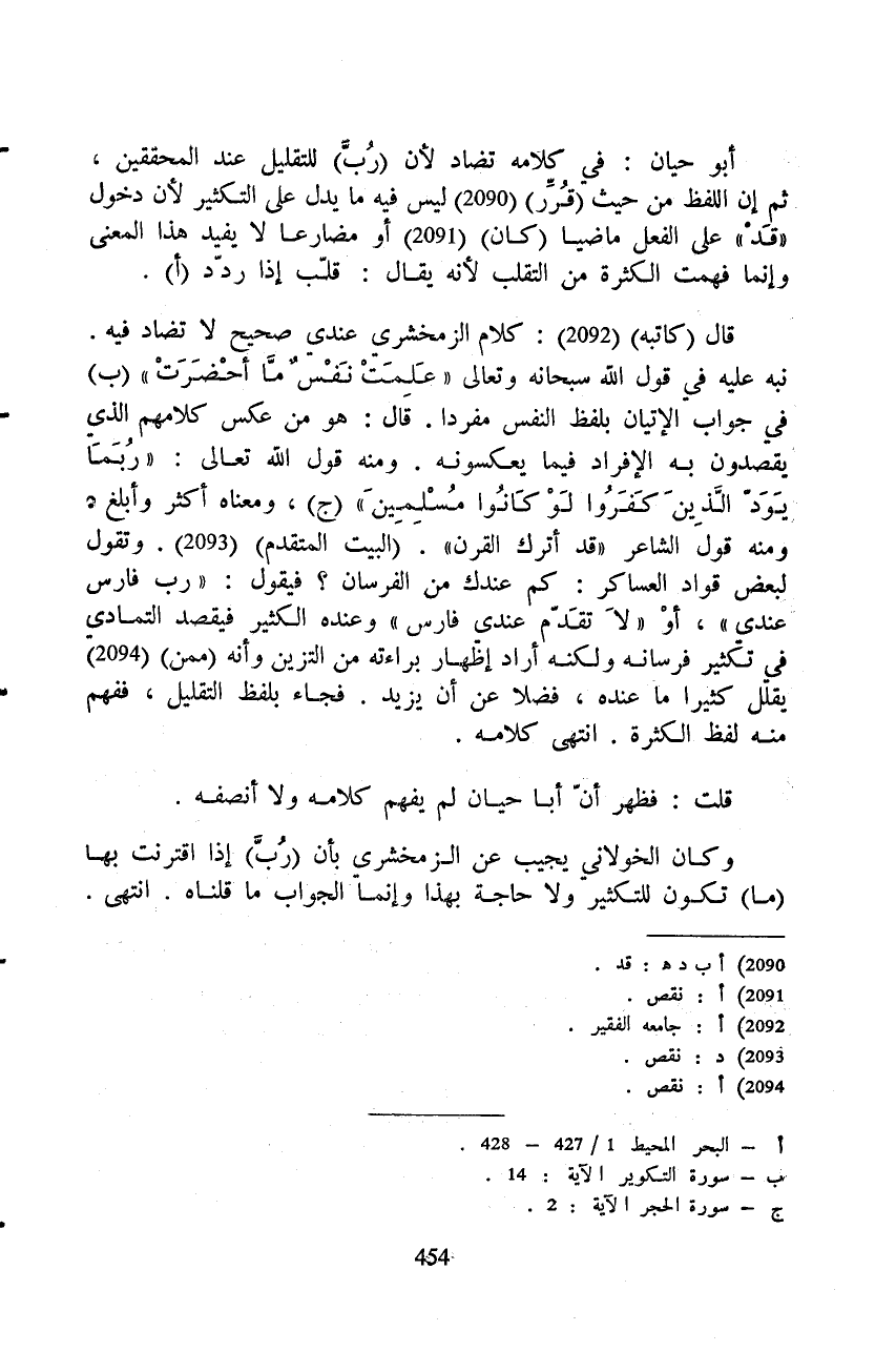 أبو حيان: في كلامه تضاد لأن (رُبَّ) للتقليل عند المحققين، ثم إن اللفظ من حيث (قُرِّر) ليس فيه ما يدل على التكثير لأن دخول «قَدْ» على الفعل ماضيا (كان) أو مضارعا لا يفيد هذا المعنى وإنما فهمت الكثرة من التقلب لأنه يقال: قلّب إذا ردّد.