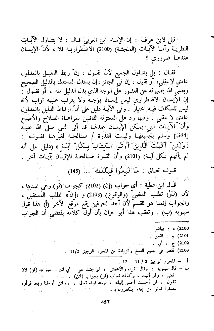 قيل لابن عرفة: إن الإمام ابن العربي قال: لا يناول الآيات النظرية وأما الآيات (الملجئة) الاضطرارية فلا، لأنّ الإيمان عندها ضروري؟