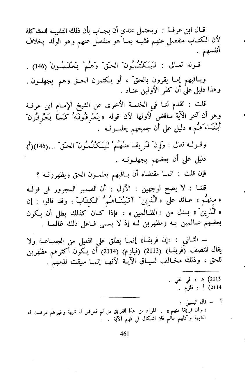 قلت: تقدم لنا في الختمة الاخرى عن الشيخ الإمام ابن عرفة وهو أن آخر الآية مناقض لأولها لأن قوله {يَعْرِفُونَهُ كَمَا يَعْرِفُونَ أَبْنَآءَهُمْ} دليل على أن جميعهم يعلمونه.