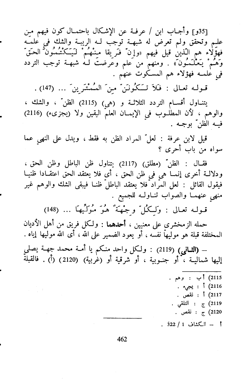 وأجاب ابن / عرفة عن الإشكال باحتمال كون فيهم مِن علِم وتحقق ولم تعرض له شبهة توجب له الريبة والشك في علمه فهؤلاء هم الّذين قيل فيهم {وَإِنَّ فَرِيقاً مِّنْهُمْ لَيَكْتُمُونَ الحق وَهُمْ يَعْلَمُونَ} . ومنهم من علم وعرضت له شبهة توجب التردد في علمه فهؤلاء هم المسكوت عنهم.