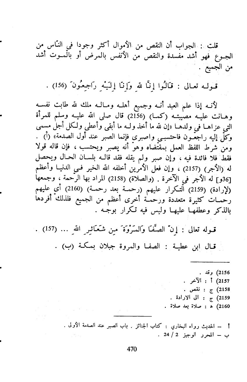 قلت: الجواب أن النقص من الأموال أكثر وجودا فى النّاس من الجوع فهو أشد مفسدة والنقص من الأنفس بالمرض أو بالموت أشد من الجميع.