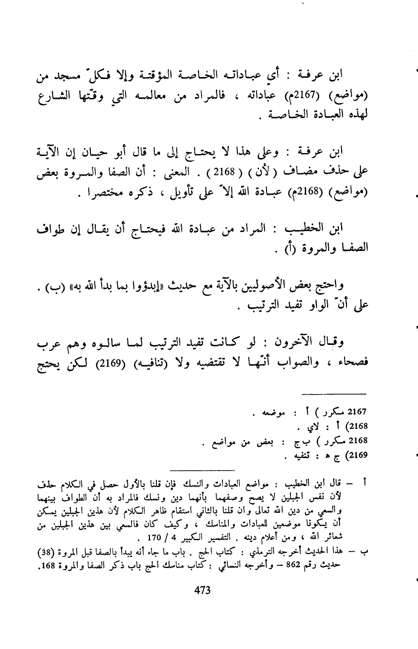 ابن عرفة: وعلى هذا لا يحتاج إلى ما قال أبو حيان إن الآية على حذف مضاف (لأن) . المعنى: أن الصفا والمروة بعض (مواضع) عبادة الله إلاّ على تأويل، ذكره مختصرا.