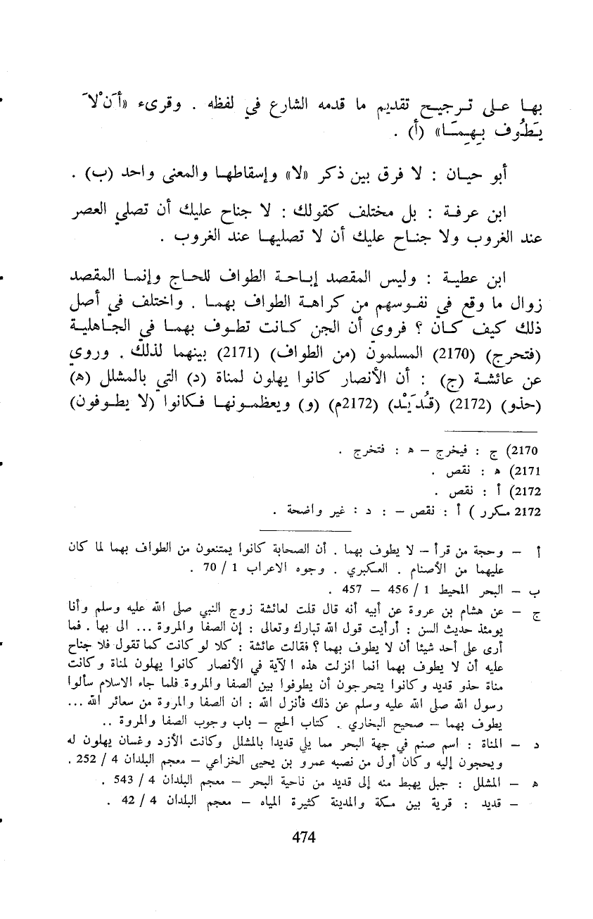 ابن عطية: وليس المقصد إباحة الطواف للحاج وإنما المقصد زوال ما وقع فى نفوسهم من كراهة الطواف بهما. واختلف في أصل ذلك كيف كان؟ فروي أن الجن كانت تطوف بهما فى الجاهلية (فتحرج) المسلمون (من الطواف) بينهما لذلك. وروي عن عائشة: أن الأنصار كانوا يهلون لمناة التي بالمشلل (حذو) (قُدَيْد) ويعظمونها فكانوا (لا يطوفون)