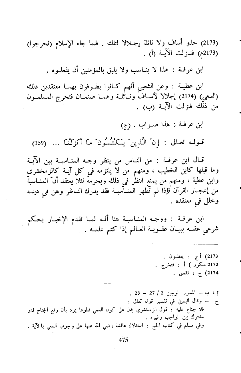 قال ابن عرفة: من الناس من ينظر وجه المناسبة بين الآية وما قبلها كابن الخطيب، ومنهم من لا يلتزمه في كل آية كالزمخشري وابن عطية، ومنهم من يمنع النظر في ذلك ويحرمه لئلا يعتقد أنّ المناسبة من إعجاز القرآن فإذا لم تظهر المناسبة فقد يدرك الناظر وهن في دينه وخلل في معتقده.