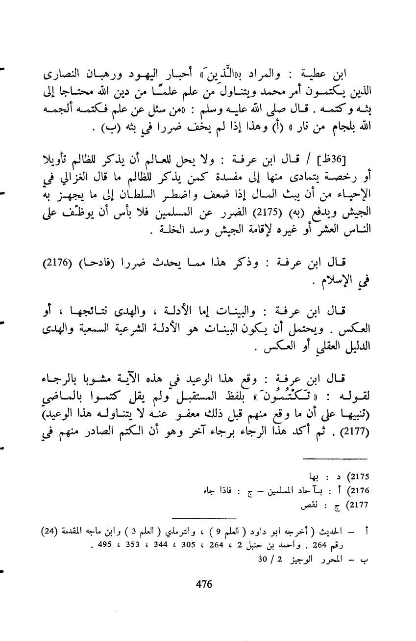 ابن عطية: والمراد ب {الذين} أحبار اليهود ورهبان النصارى الذين يكتمون أمر محمد ويتناول من علم علماً من دين الله محتاجا إلى بثه وكتمه. قال صَلَّى اللَّهُ عَلَيْهِ وَسَلَّم َ: «من سئل عن علم فكتمه ألجمه الله بلجام من نار» وهذا إذا لم يخف ضررا في بثه.