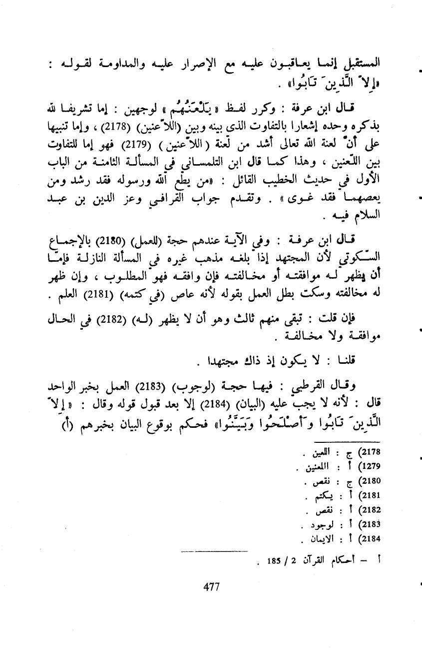 قال ابن عرفة: وفي الآية عندهم حجة (للعمل) بالإجماع السّكوتي لأن المجتهد إذا بلغه مذهب غيره في المسألة النازلة فإمّا أن يظهر له موافقته أو مخالفته فإن وافقه فهو المطلوب، وإن ظهر له مخالفته وسكت بطل العمل بقوله لأنه عاص (في كتمه) العلم.