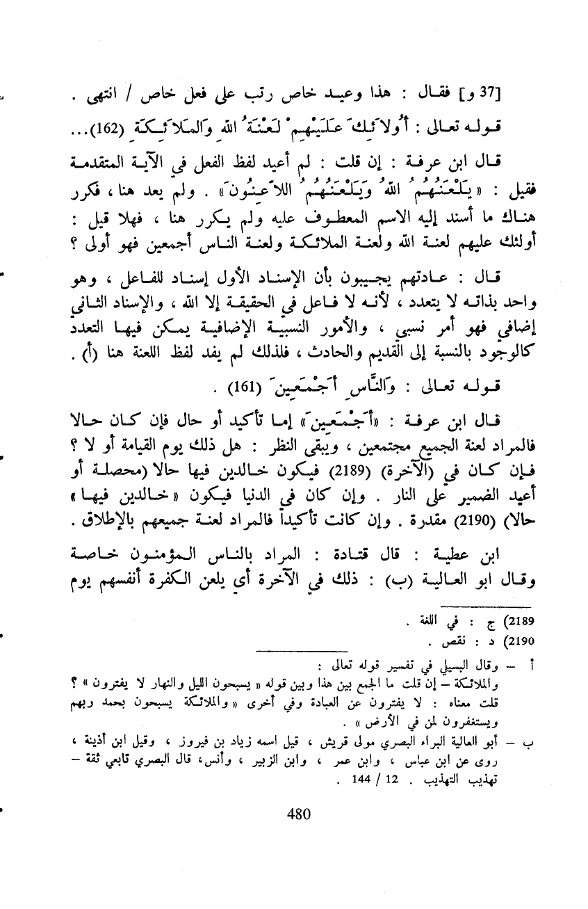 قال: عادتهم يجيبون بأن الإسناد الأول للفاعل، وهو واحد بذاته لايتعدد، لأنه لا فاعل في الحقيقة إلا الله، والإسناد الثاني إضافي فهو أمر نسبي، والأمور النسبية الإضافية يمكن فيها التعدد كالوجود بالنسبة إلى القديم والحادث، فلذلك لم يفد لفظ اللعنة هنا.