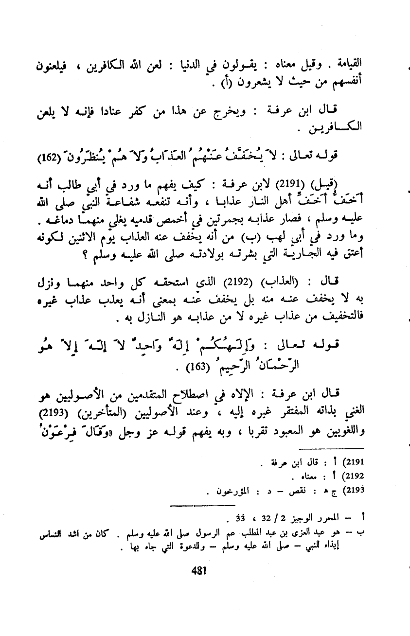 (قيل) لابن عرفة: كيف يفهم ما ورد في أبي طالب أنه أَخَفُّ أَخَفِّ أهل النار عذابا، وأنه تنفعه شفاعة النبي صَلَّى اللَّهُ عَلَيْهِ وَسَلَّم َ، فصار عذابه بجمرتين في أخمص قدميه يغلي منهما دماغه. وما ورد في أبي لهب من أنه يخفف عنه العذاب يوم الاثنين لكونه أعتق فيه الجارية التي بشرته بولادته صَلَّى اللَّهُ عَلَيْهِ وَسَلَّم َ؟