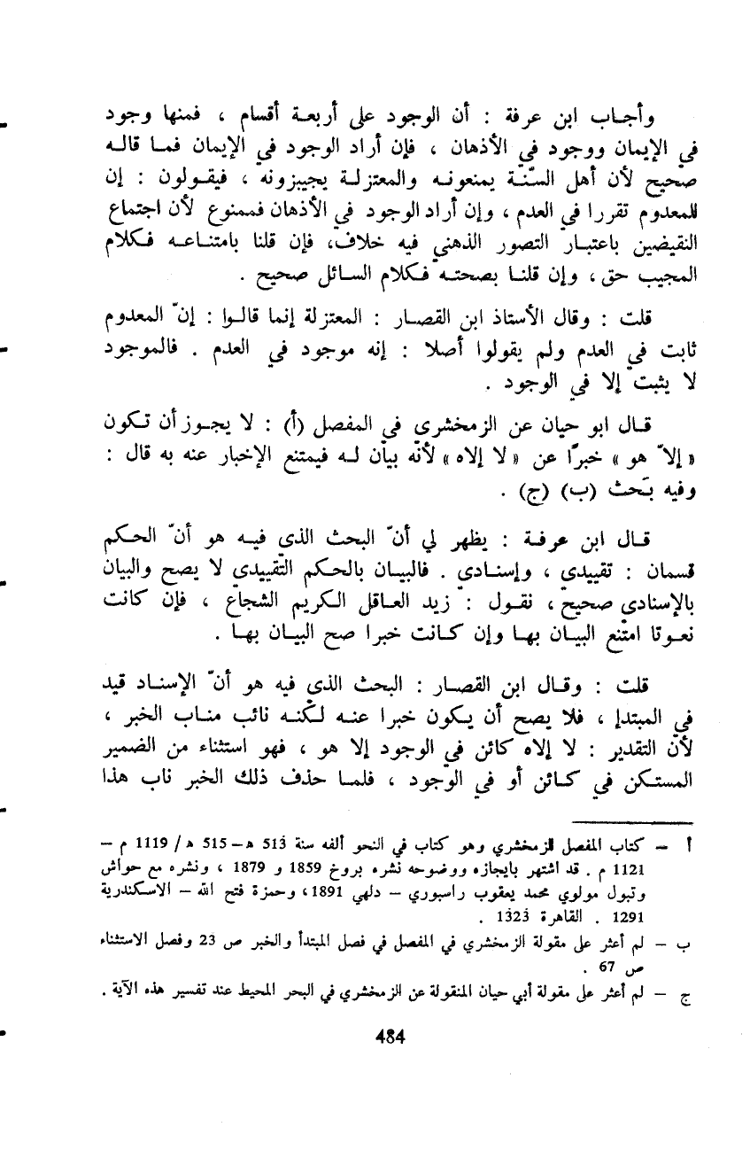 وأجاب ابن عرفة: أن الوجود على أربعة أقسام، فمنها وجود في الإيمان ووجود في الأذهان، فإن أراد الوجود في الإيمان فما قاله صحيح لأن أهل السّنة يمنعونه والمعتزلة يجيزونه، فيقولون: إن للمعدوم تقررا في العدم، وإن أراد الوجود في الأذهان فممنوع لأن اجتماع النقيضين باعتبار التصور الذهني فيه خلاف، فإن قلنا بامتناعه فكلام المجيب حق، وإن قلنا بصحته فكلام السائل صحيح.