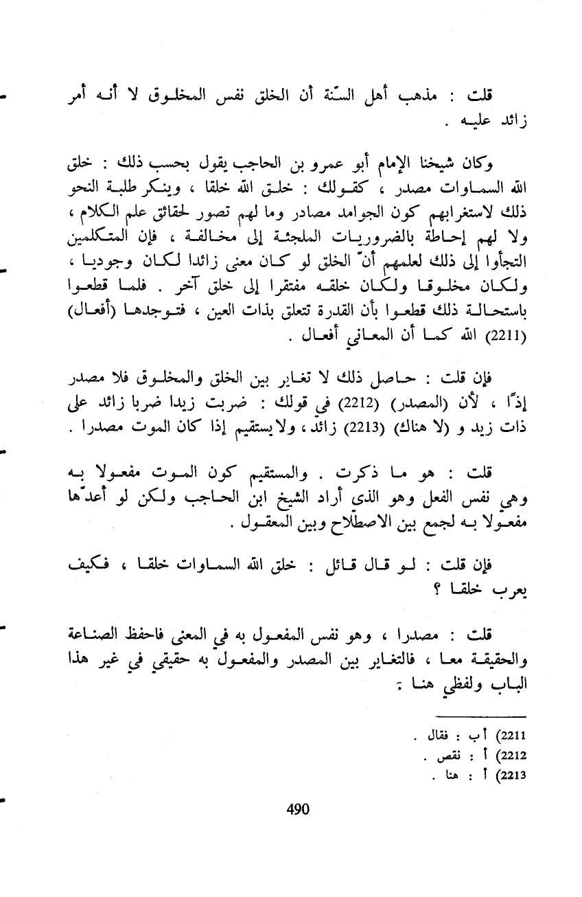 وكان شيخنا الإمام أبو عمرو بن الحاجب يقول بحسب ذلك: خلق الله السماوات مصدر، كقولك: خلق الله خلقا، وينكر طلبة النحو ذلك لاستغرابهم كون الجوامد مصادر وما لهم تصور لحقائق علم الكلام، ولا لهم إحاطة بالضروريات الملجئة إلى مخالفة، فإن المتكلمين التجأوا إلى ذلك لعلمهم أنّ الخلق لو كان معنى زائدا لكان وجوديا، ولكان مخلوقا ولكان خلقه مفتقرا إلى خلق آخر. فلما قطعوا باستحالة ذلك قطعوا بأن القدرة تتعلق بذات العين، فتوجدها (أفعال) الله كما أن المعاني أفعال.