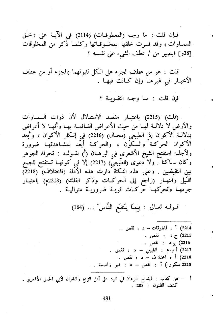 (قلت) باعتبار مقصد الاستدلال لأن ذوات السماوات والأرض لا دلالة لها من حيث الأعراض القائمة بها وأنها لا أعراض بدلالة الأكوان إذ الطبيعي (محال) في إنكار الأكوان، وأبعد الأكوان الحركة والسكون، والحركة أبعد لمشاهدتها ضرورة ولأجله استفتح الشيخ الأشعري في البرهان لقوله: تحرك الجوهر وكان ساكنا.