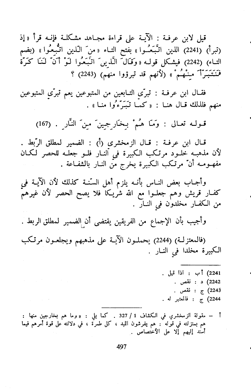 قال ابن عرفة: قال الزمخشري: الضمير لمطلق الرّبط. لأن مذهبه خلود مرتكب الكبيرة في النار فلو جعله للحصر لكان مفهومه أنّ مرتكب الكبيرة يخرج من النار بالشفاعة.